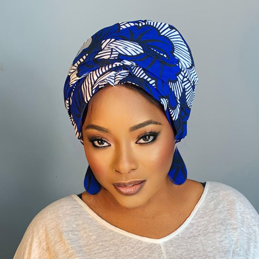 Ensemble Boucles d'Oreilles et Bonnet Satin en Wax Bleu | Turban en Wax avec Doublure Satin Lined hair
