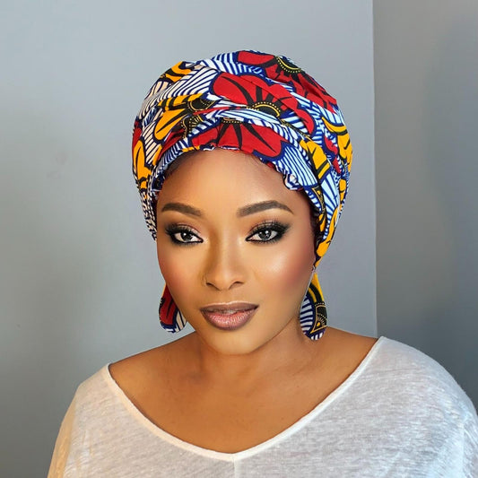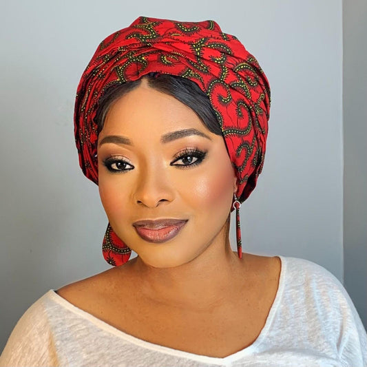 Ensemble Boucles d'Oreilles et Bonnet Satin en Wax Rouge | Turban en Wax avec Doublure Satin Lined hair.