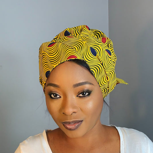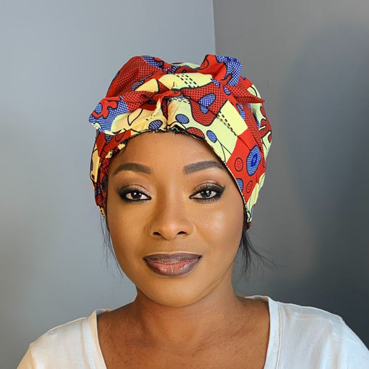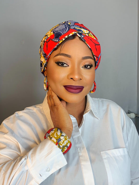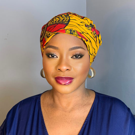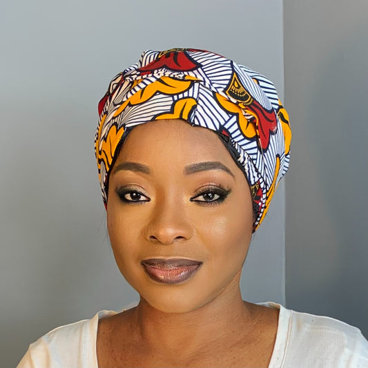 Rot-gelber Satin-Turbanhut | Wachsturban mit Satinfutter