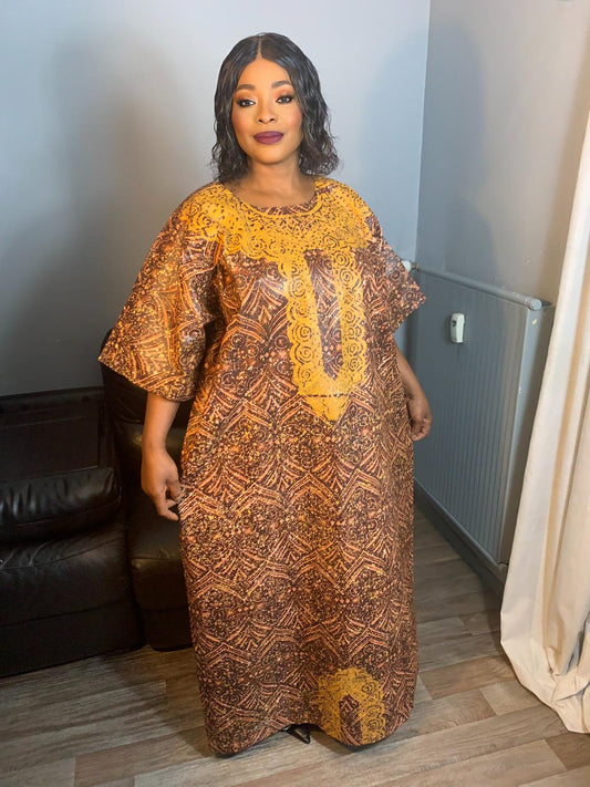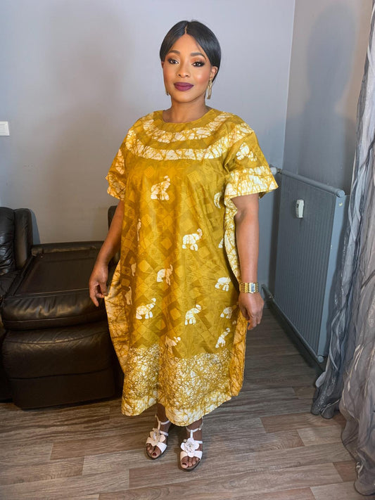 Robe Bazin Batik Moutarde Style Bohème Motif Éléphants Robes Moutarde Design, l'art 100% Coton très doux