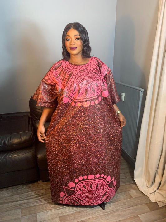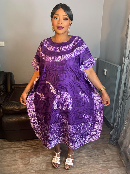 Robe Bazin Batik Style Bohème a Motifs Violet Mauve,Design Motif Éléphants L'art 100% Coton très doux.