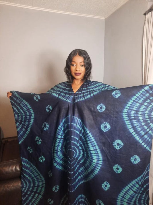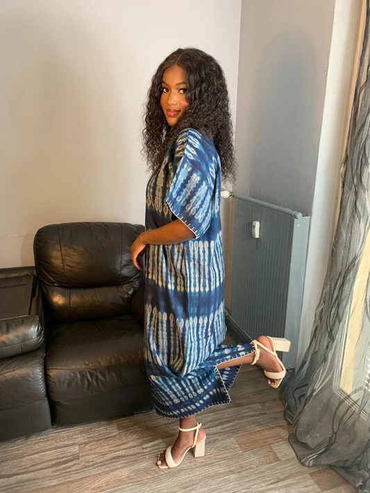 Langes Kleid aus Indigo-Kaftan-Seide in Marineblau