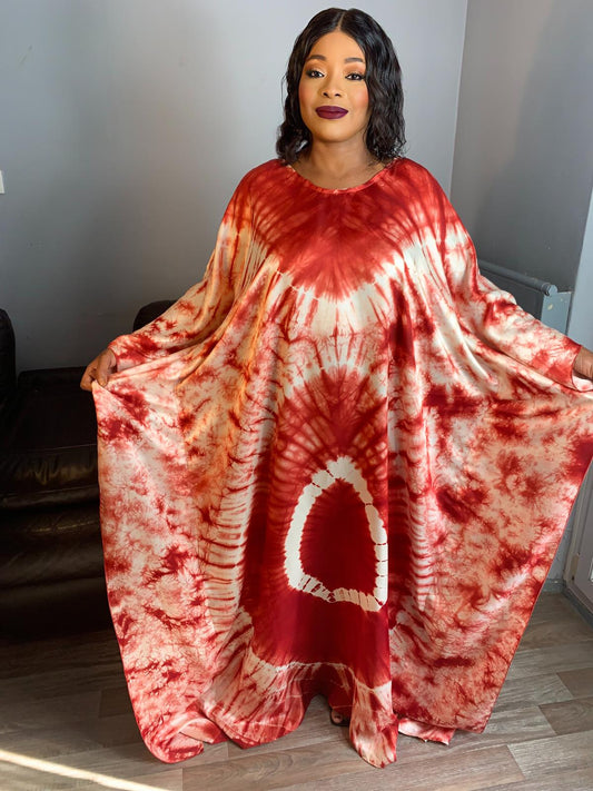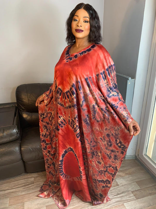 Adiré Red Caftan Silk Boubou – Tie and Dye Silk Long Dress Adire Silk Batik