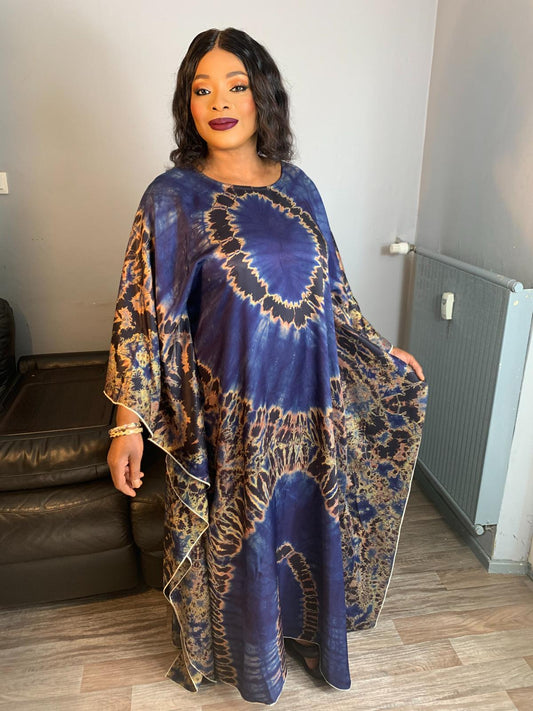 Adiré Seiden-Boubou-Kaftan Blau – Langes Kleid aus Batikseide aus Adire-Seide