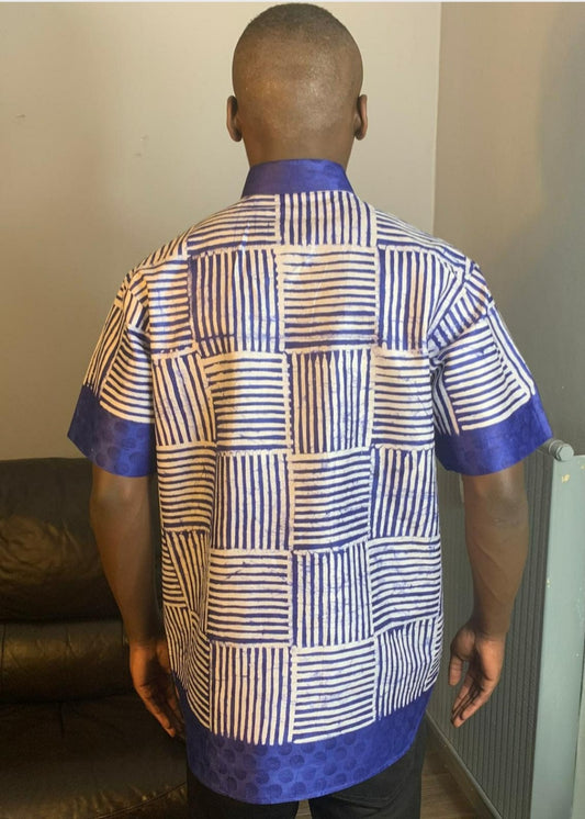 Zweifarbiges Herrenhemd, Adiré Kampala, Bazin Batik, Streifen, blau schwarz weiß, Muster auf blauem Hintergrund.
