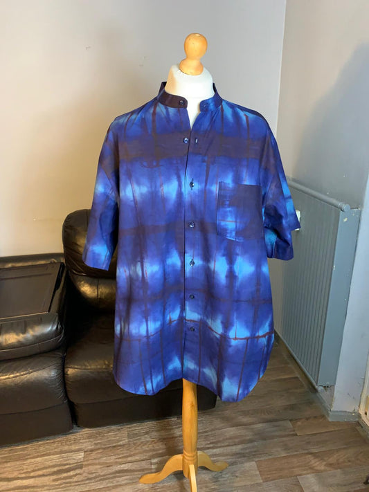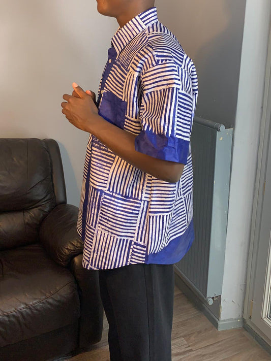 Blau-weißes Herrenhemd. Bazin Batik Kampala Adire, weiche Baumwolle binden und färben.