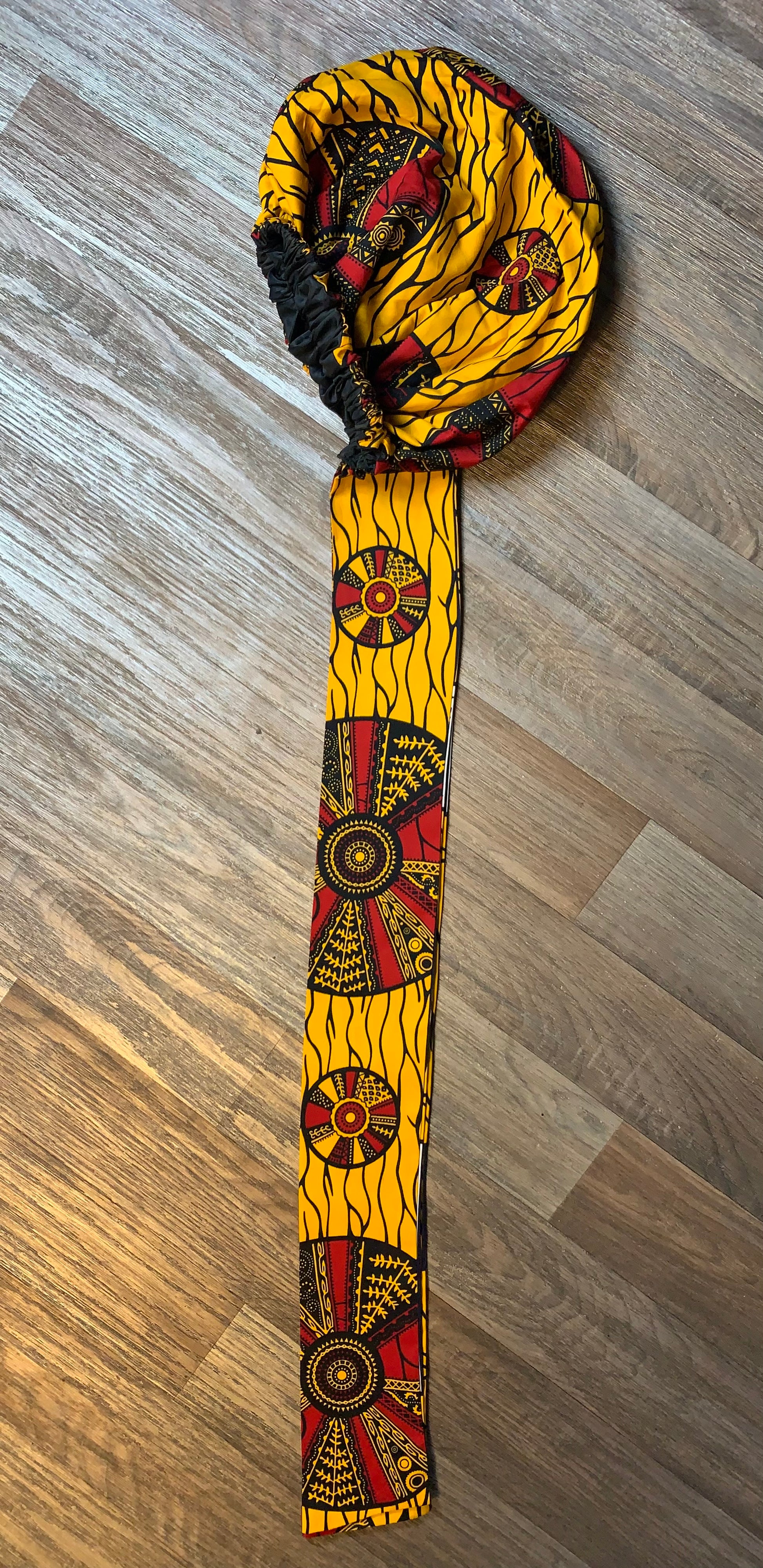 Entdecken Sie unseren großen handgefertigten Turban mit schwarzem Satinfutter. Diese gelb-rote Turban-Haube aus Satin ist auch für Anfänger leicht zu binden und kann auf viele Arten gestylt werden. Es passt sich perfekt an alle Haartypen an: lockig, Afro, Rasta.