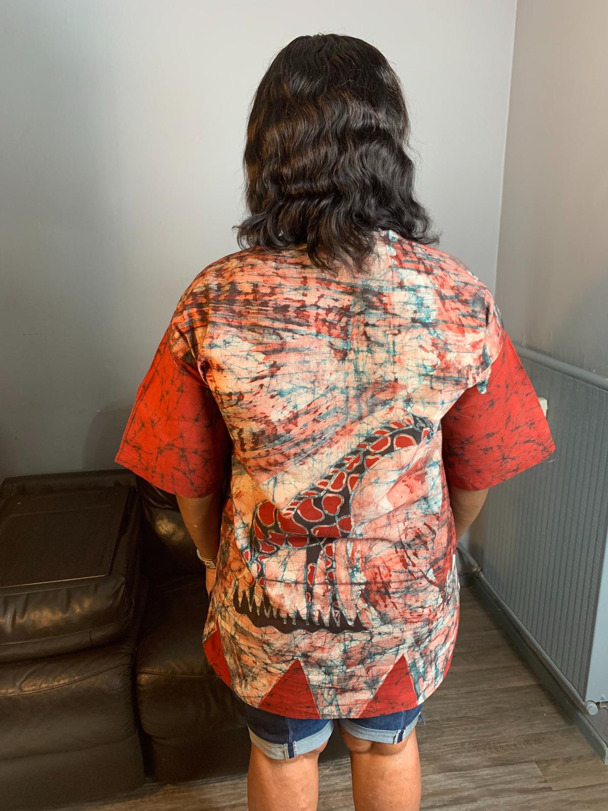 Entdecken Sie unser einzigartiges afrikanisches Batikhemd mit Safari-Tiermustern. Jedes Hemd wird in Westafrika nach der international bekannten nachhaltigen Yoruba-Methode handgefertigt, was außergewöhnliche handgefertigte Designs gewährleistet. Jedes Stück besteht aus 100 % Baumwolle und bietet höchsten Komfort und unvergleichliche Weichheit.