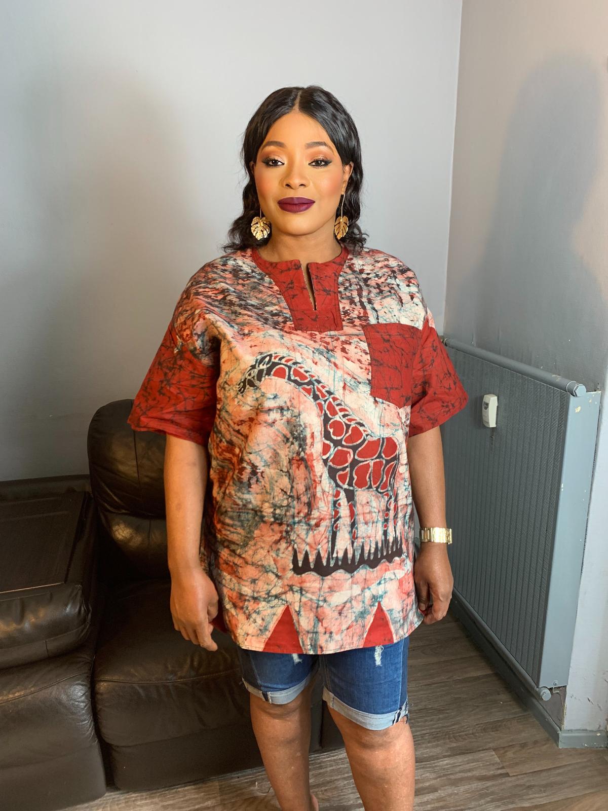 Baumwollhemd mit gemischtem Batik-Safari-Tiermuster - Burgunderrote Giraffe