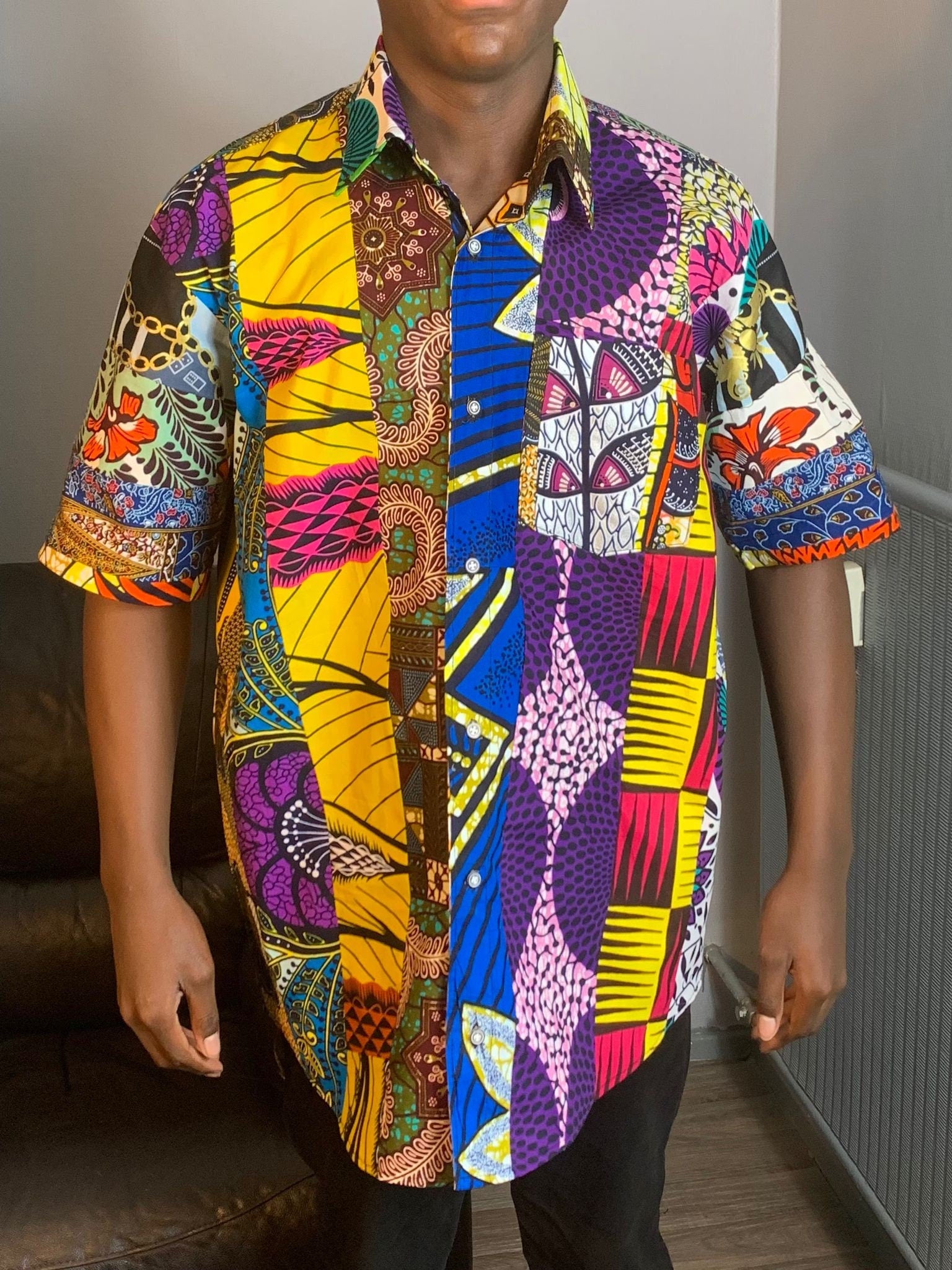 Herren-Patchworkhemd aus Wachs mit Ankara-Kragen, bunt, 100 % weiche Baumwolle, mehrfarbig.