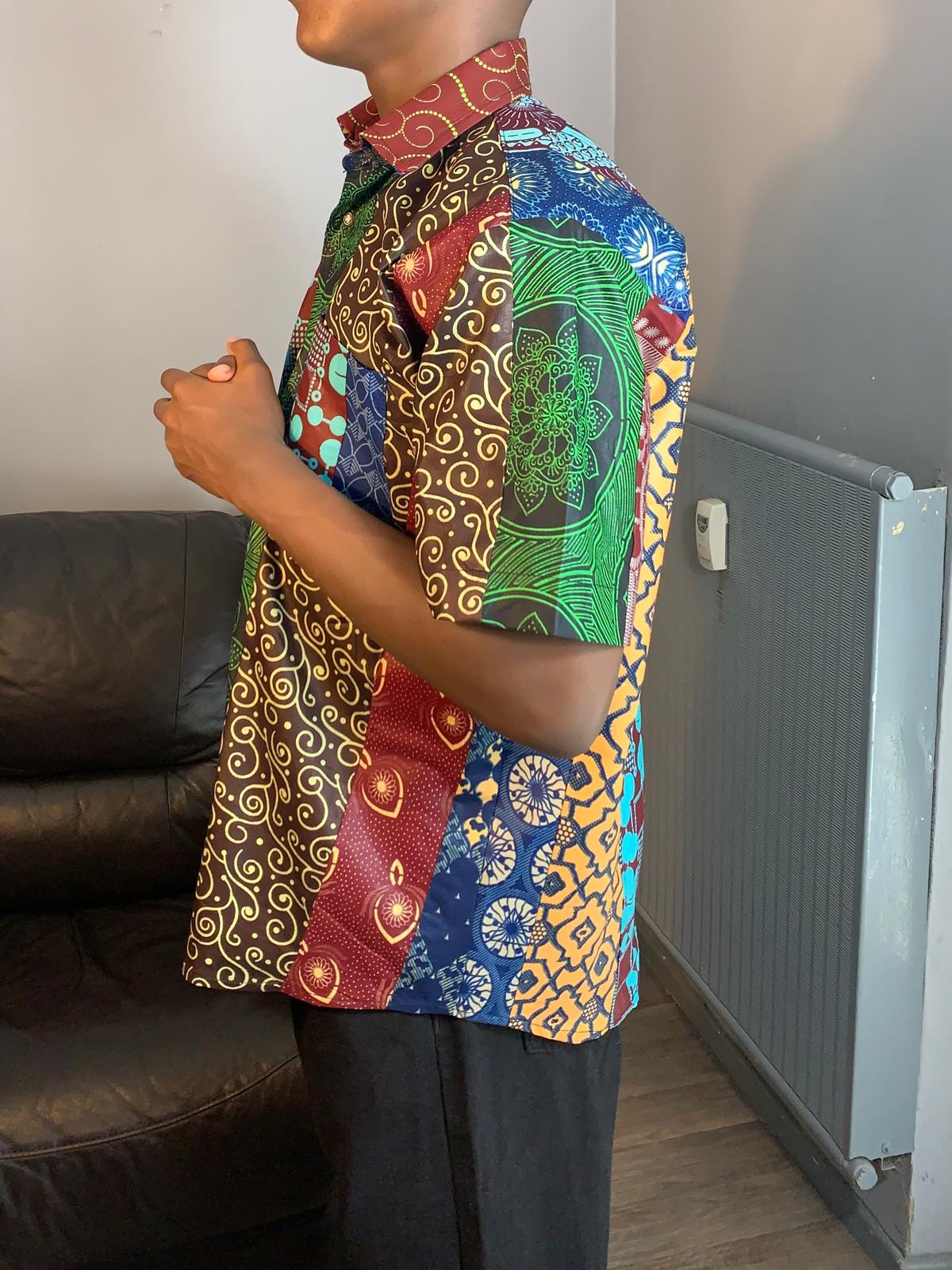 Ankara-Wachs-Patchwork-Shirt. Es gibt nur 2 Exemplare. Englischer Wachsstoff. Eine sehr originelle und umweltfreundliche Mischung aus recycelten Wachsstoffen. Unsere Hemden wurden sorgfältig in unserer Werkstatt in Westafrika hergestellt. Material: 100 % Baumwolle.