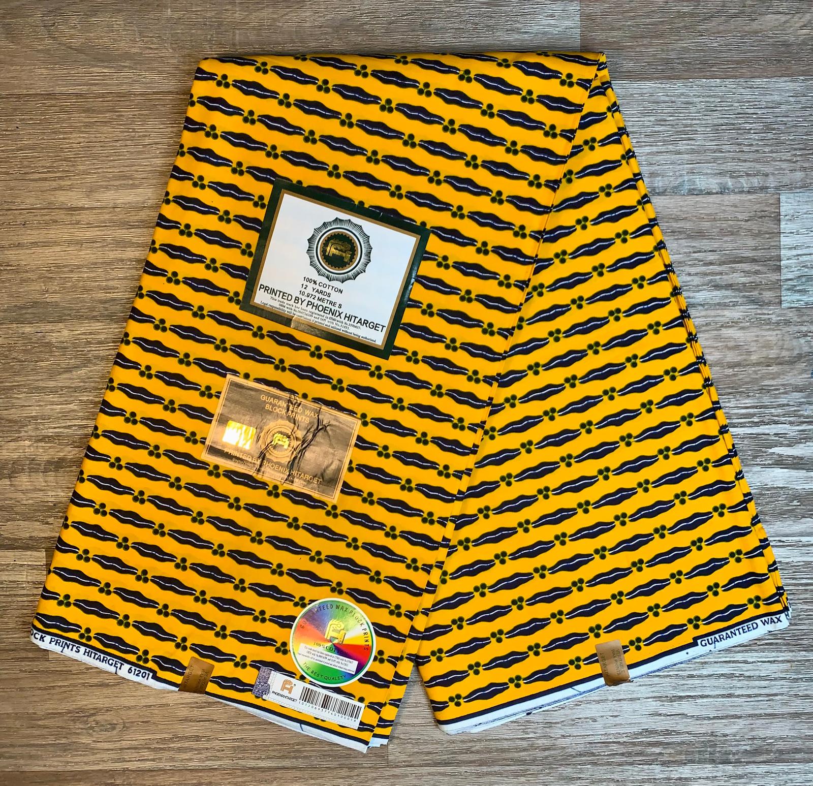 Tissus Wax Hitarget de qualité supérieure. Longueur : 1,16m. 1 yards (0,91m), 2 yards (1,82m), 3 yards (2,74m), 4 yards (3,65m), 5 yards (4,57m), 6 yards (5,48m), et 12 yards (10.97m). Largeur du tissus : 0,91m. Matière : 100% coton. Wax très doux