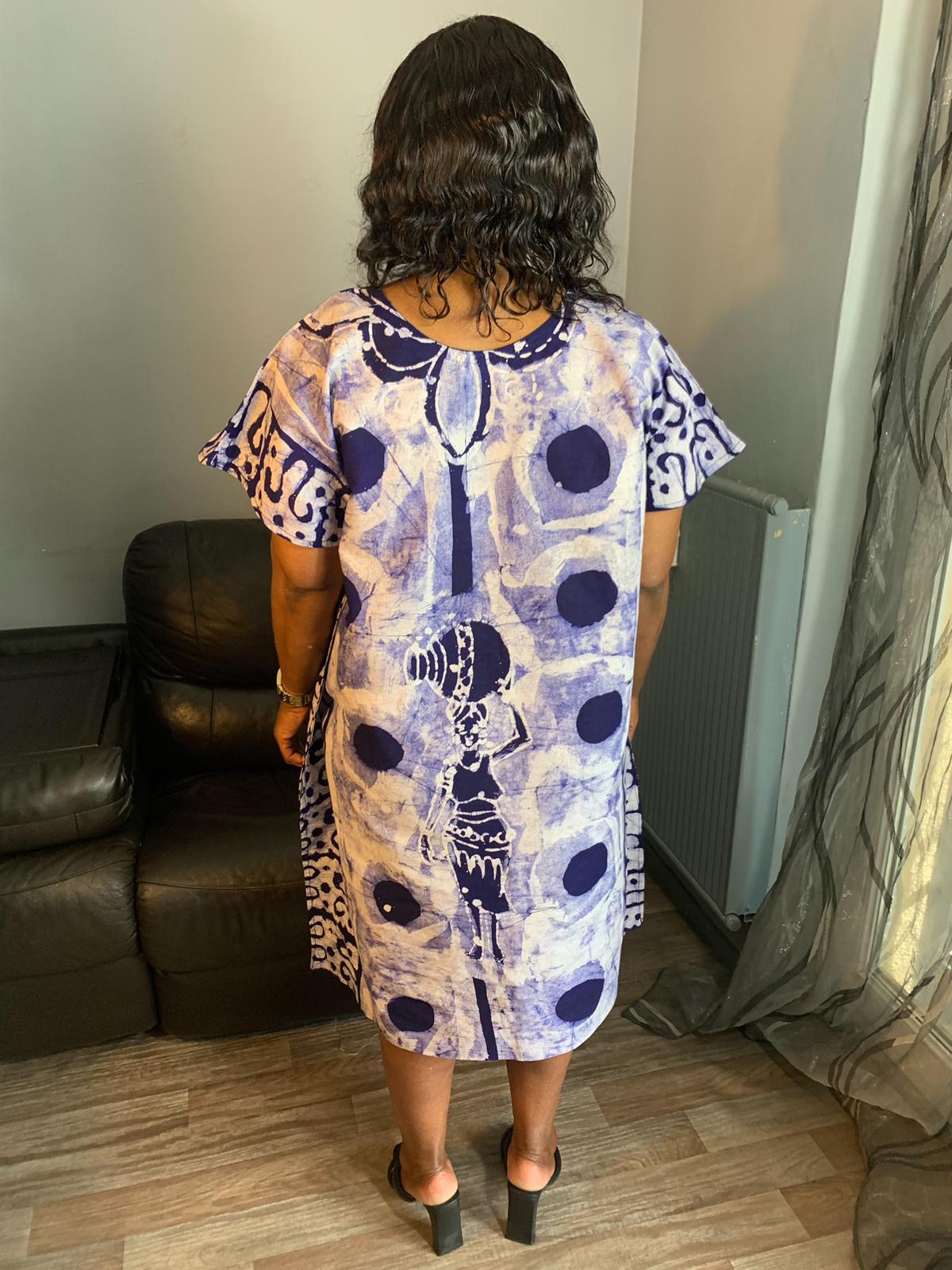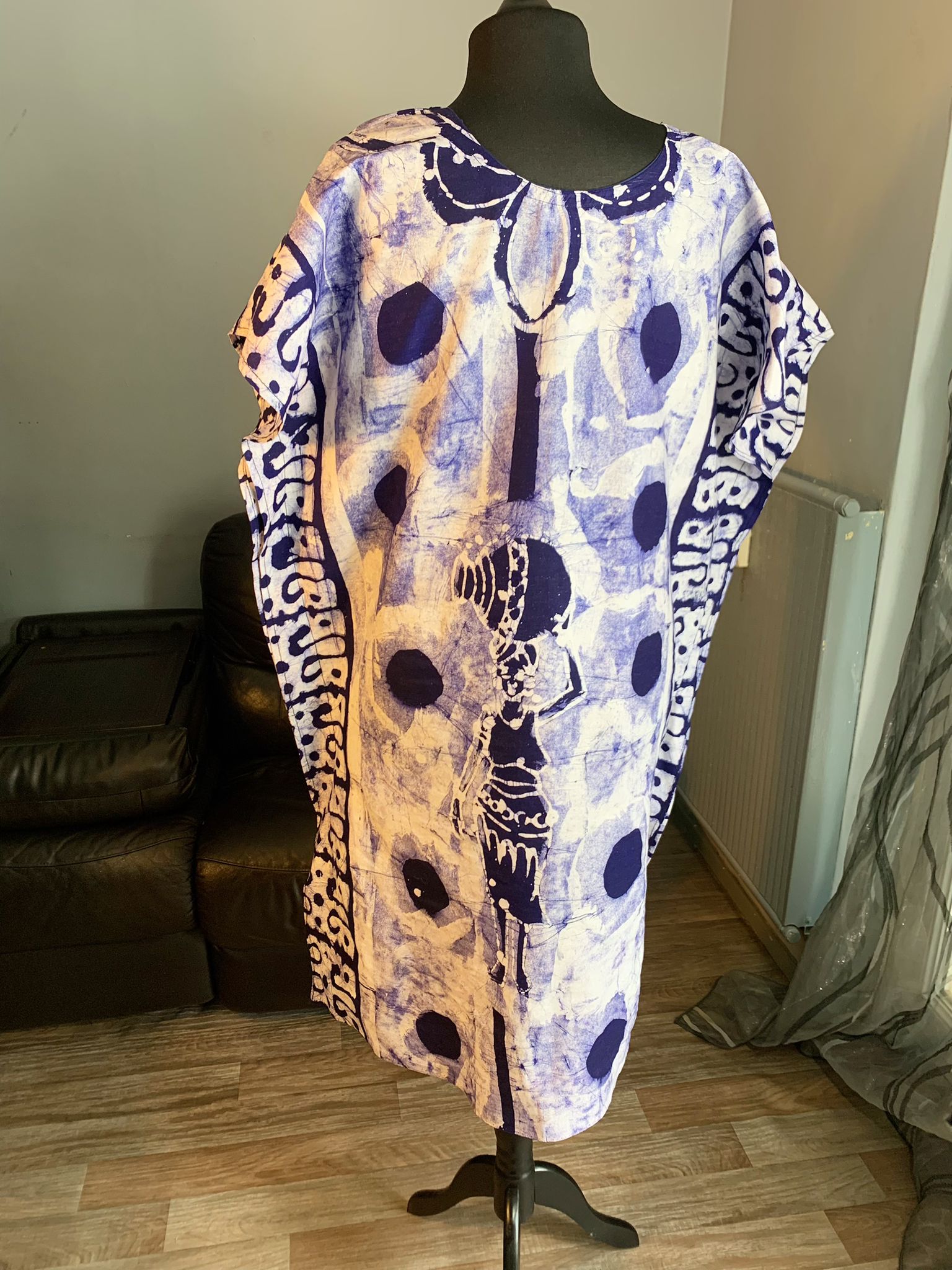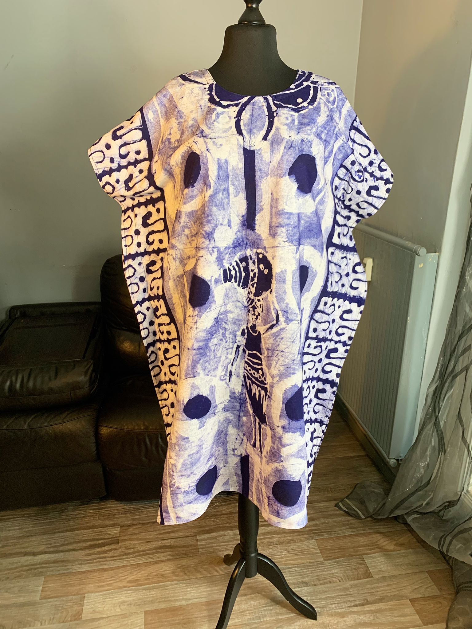 Batik-Boubou-Kleid. Handgefärbt. In handwerklicher Handarbeit gefertigte Muster. Material: 100 % Baumwolle. Rundhalsausschnitt.
