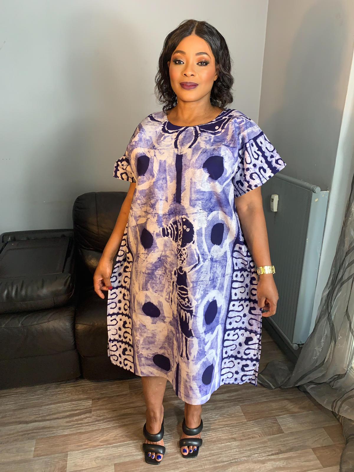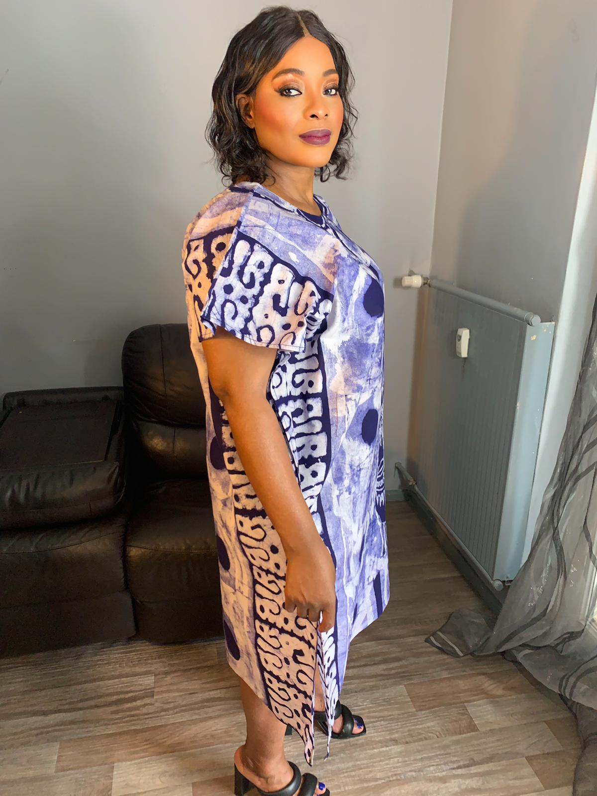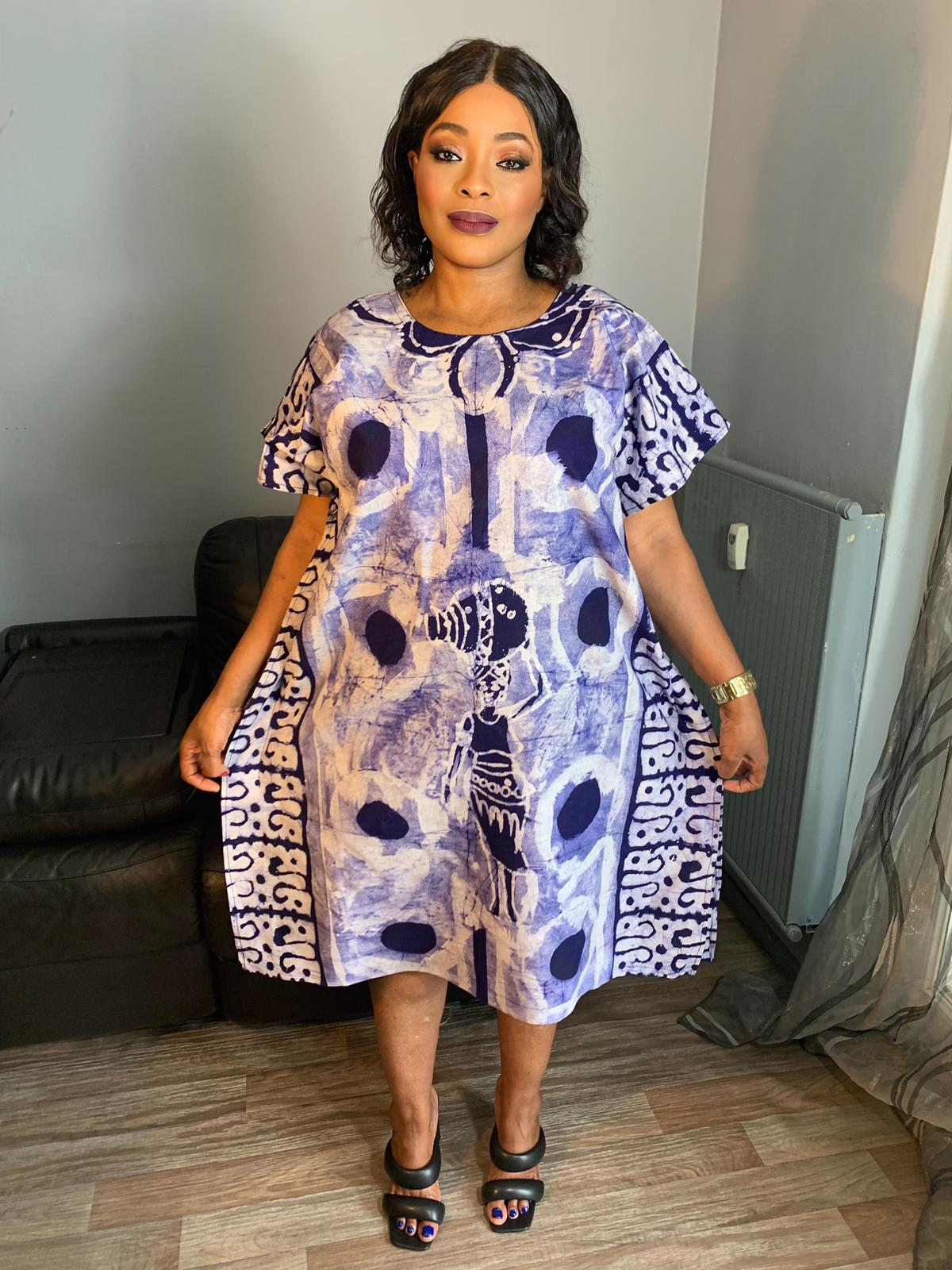 Batik-Boubou-Kleid. Handgefärbt. In handwerklicher Handarbeit gefertigte Muster. Material: 100 % Baumwolle. Rundhalsausschnitt.