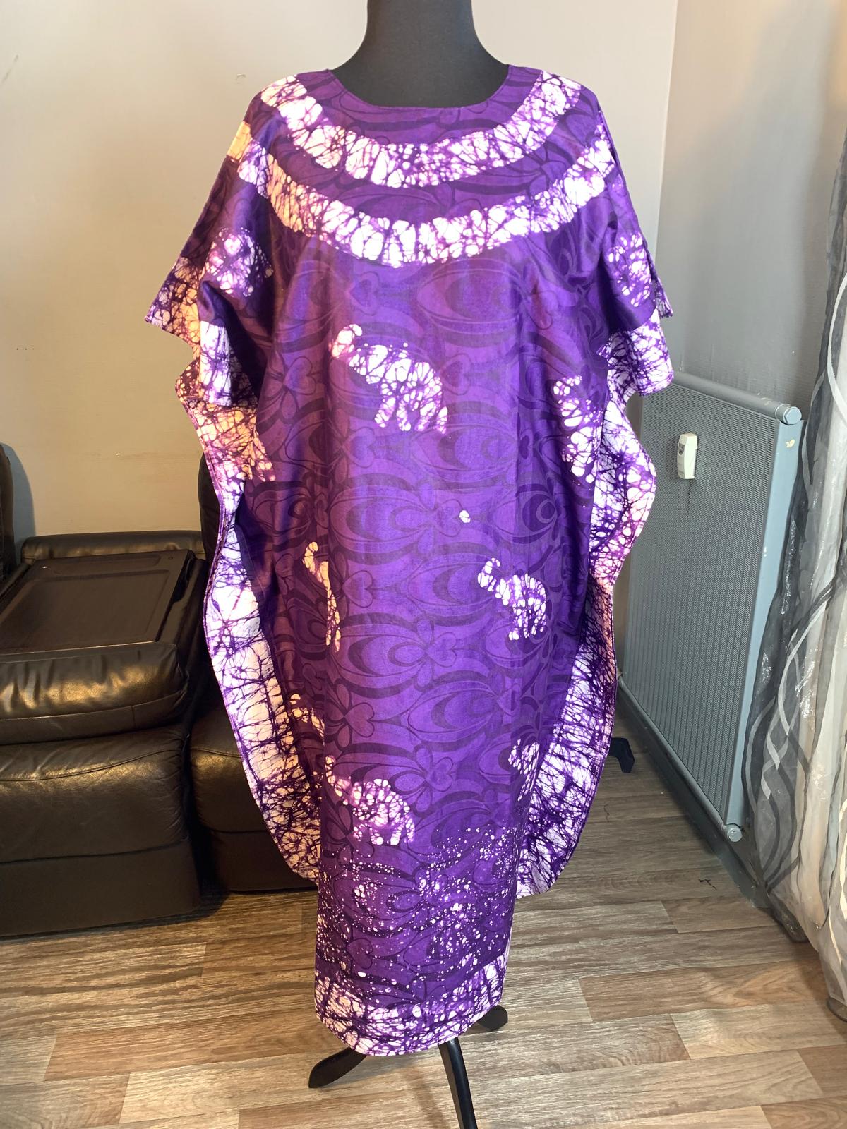 Robe Bazin Batik Style Bohème Robe à Motifs. Violet Motifs: Éléphants L'art 100% Coton Très Doux.