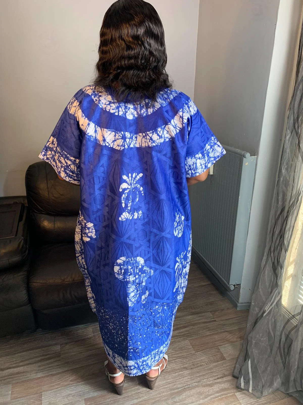 Königsblaues Bazin-Batikkleid im böhmischen Stil. Einzigartiges und exklusives Kleid. Gemustertes Kleid, Motivdesign: Fall, Tata Samba, Afrika, Kunst.