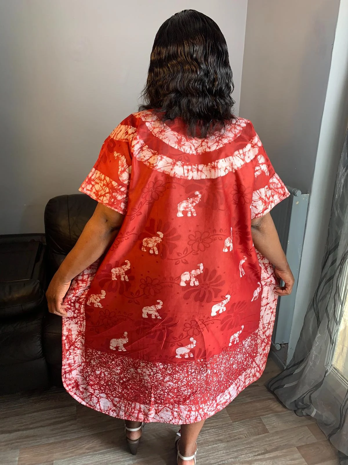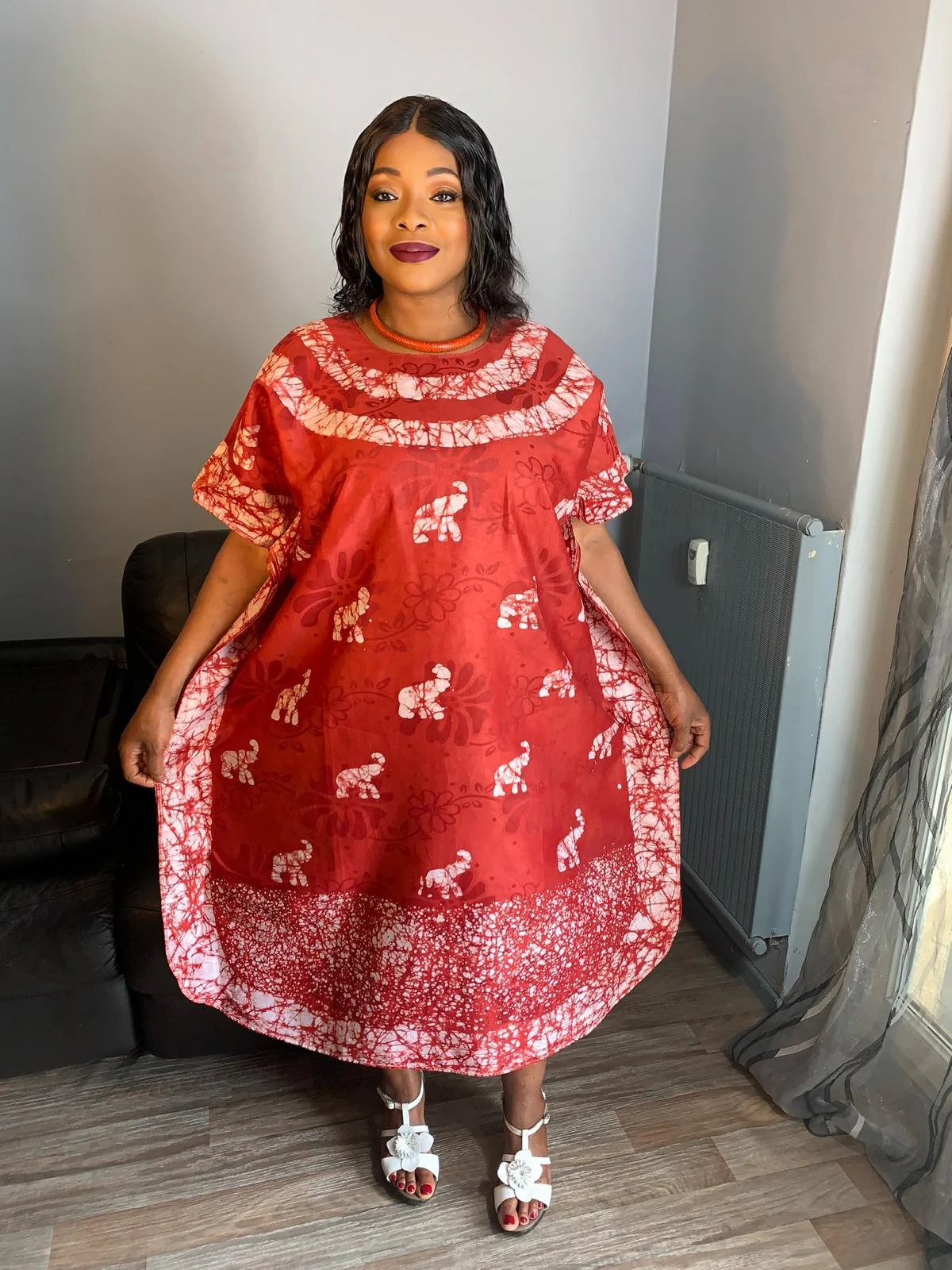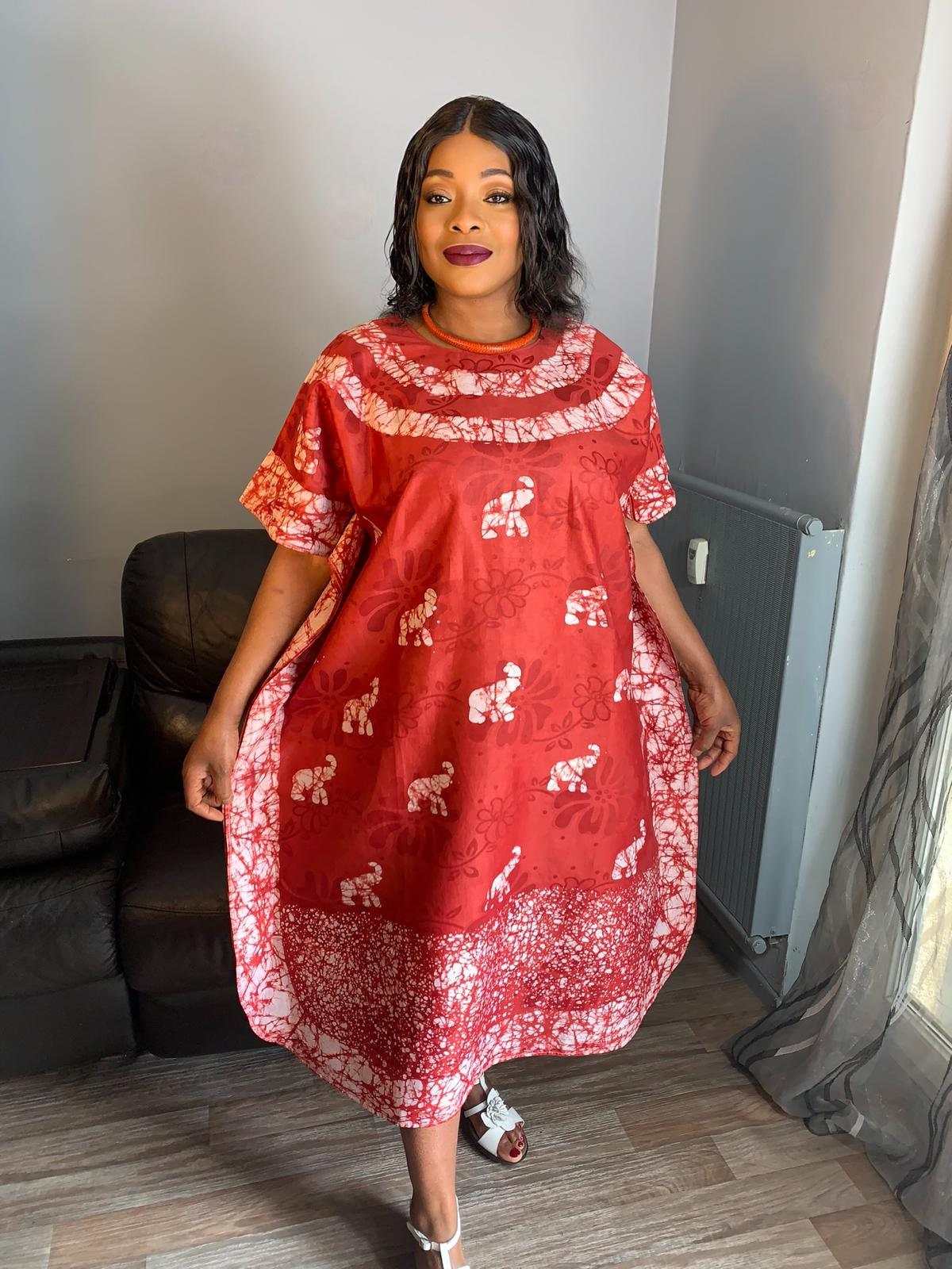 Bazin Batik-Kleid im Bohemian-Stil, Burgunderrot. Einzigartiges und exklusives Kleid. Gemustertes Kleiddesign, Elefantenmusterkunst