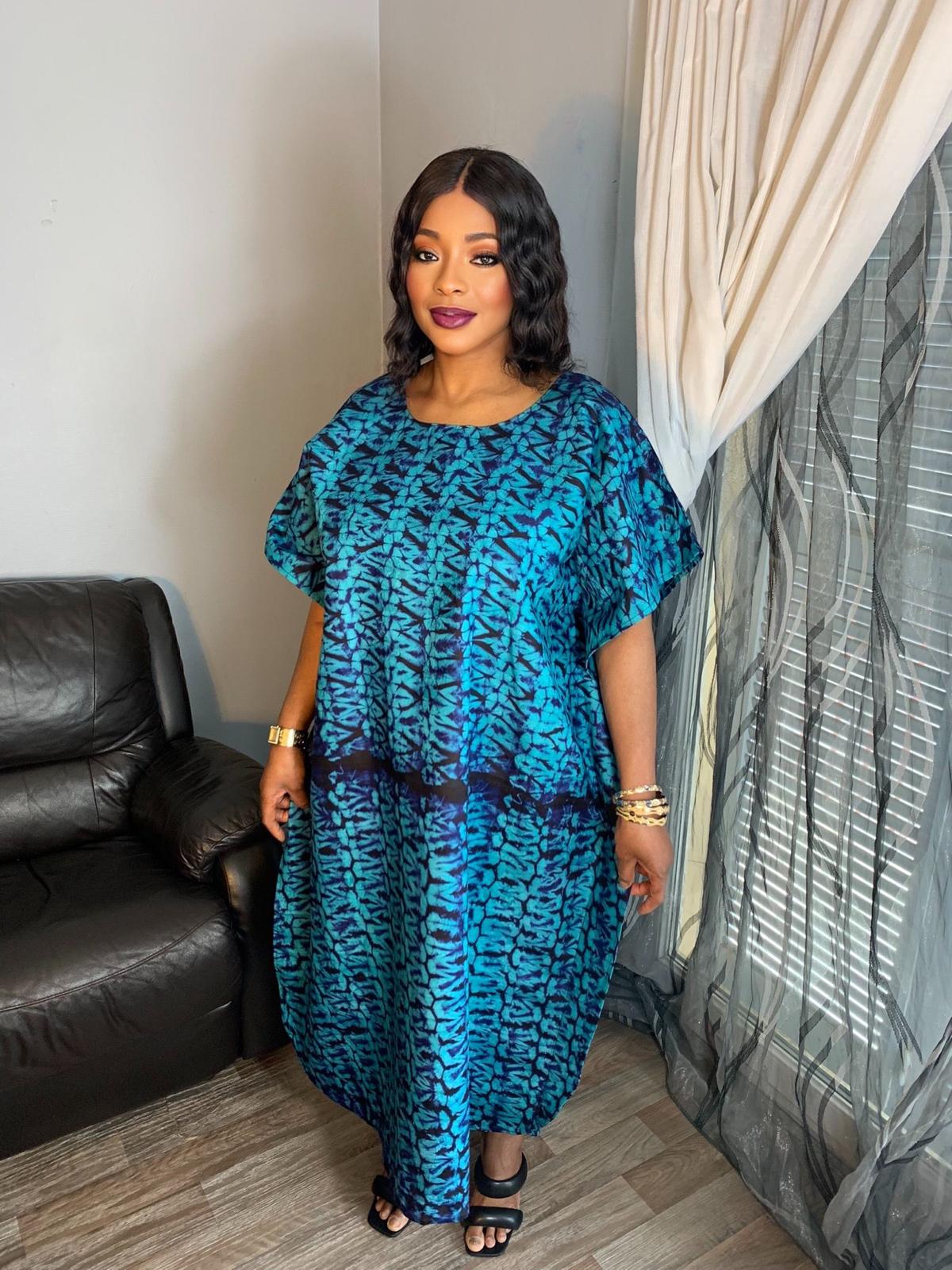 Dieses prächtige afrikanische Bazin-Boubou zum Binden und Färben ist eine Einheitsgröße; Das Outfit wurde unter Berücksichtigung aller Formen und Größen entworfen