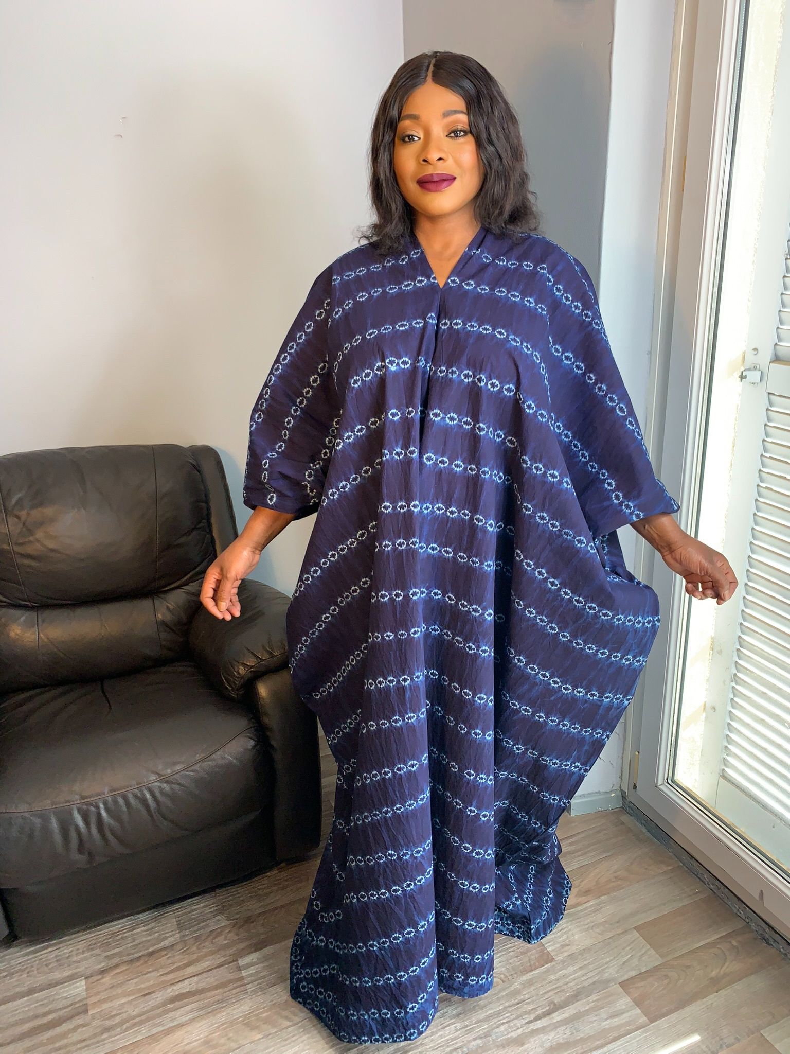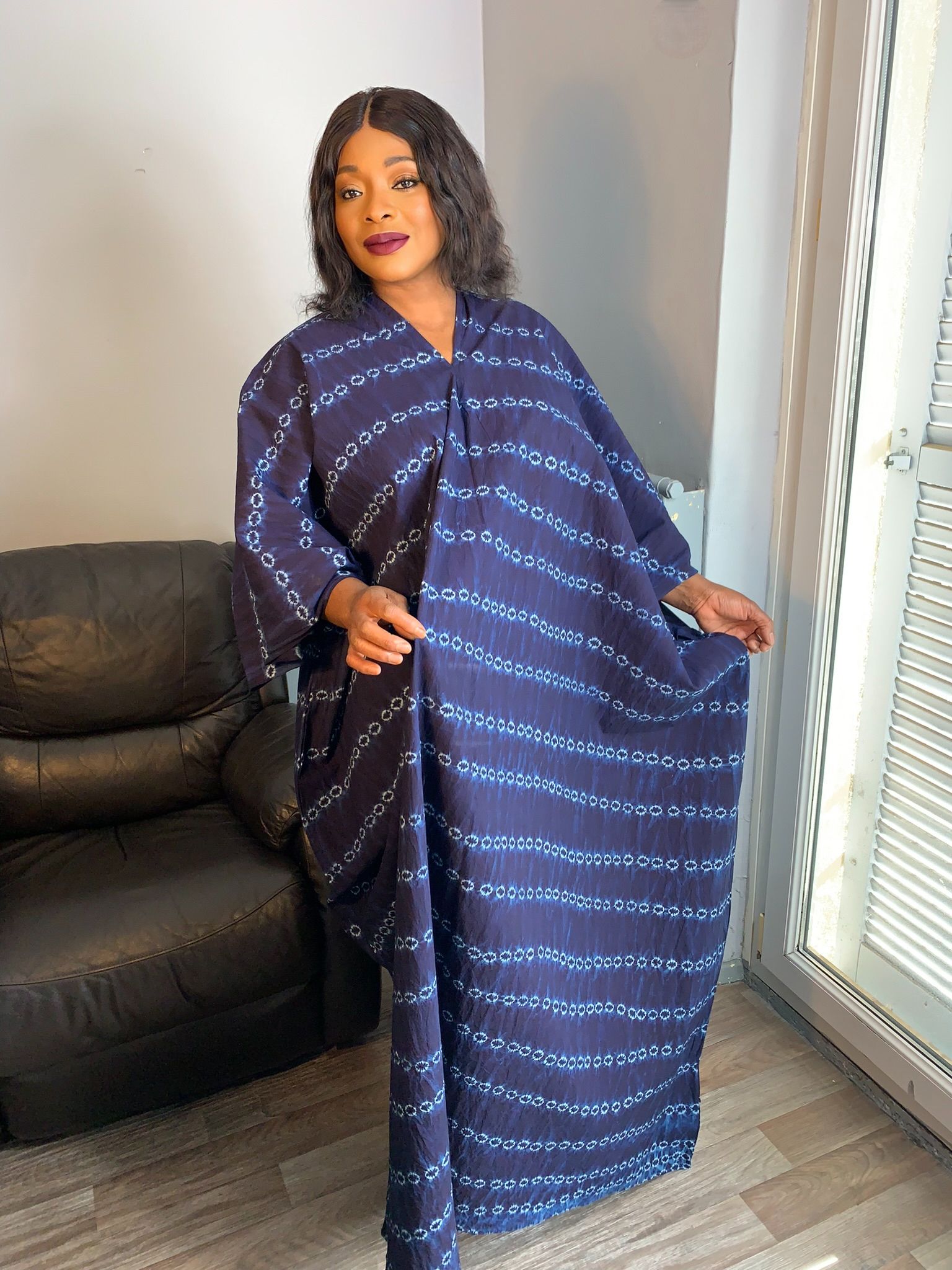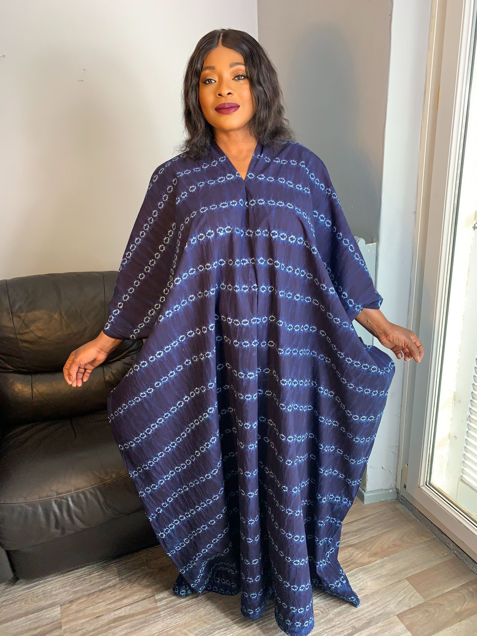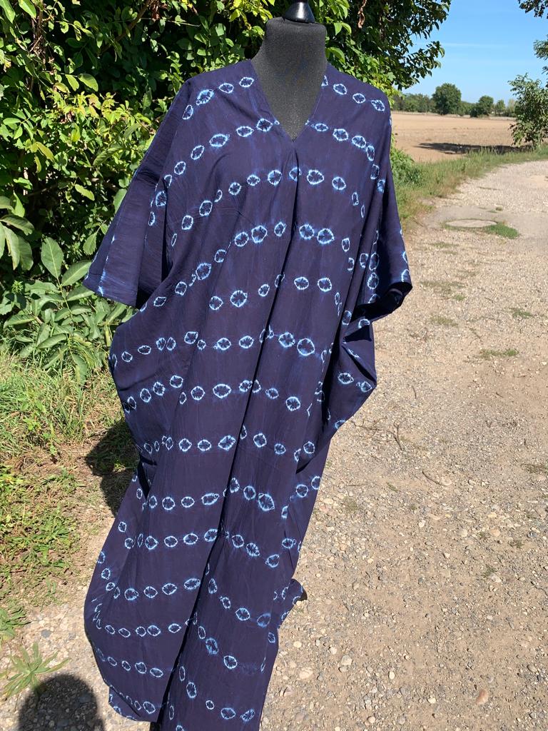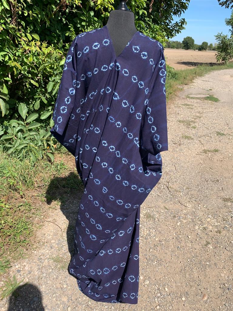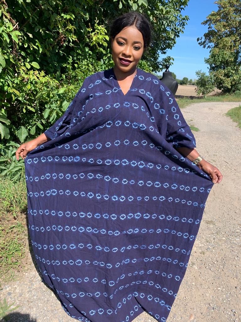 Mali Adire Blau-Indigo-Kleid. Sehr weiches Material aus 100 % Baumwolle. Natürlicher Farbstoff mit Indigoblättern.