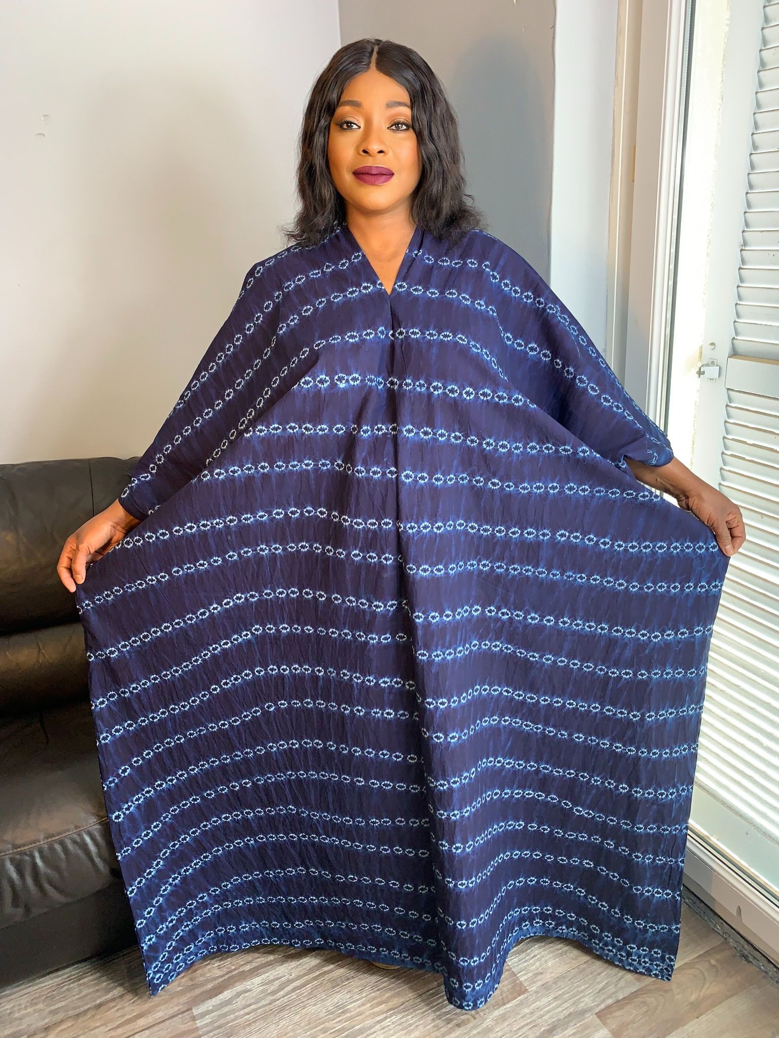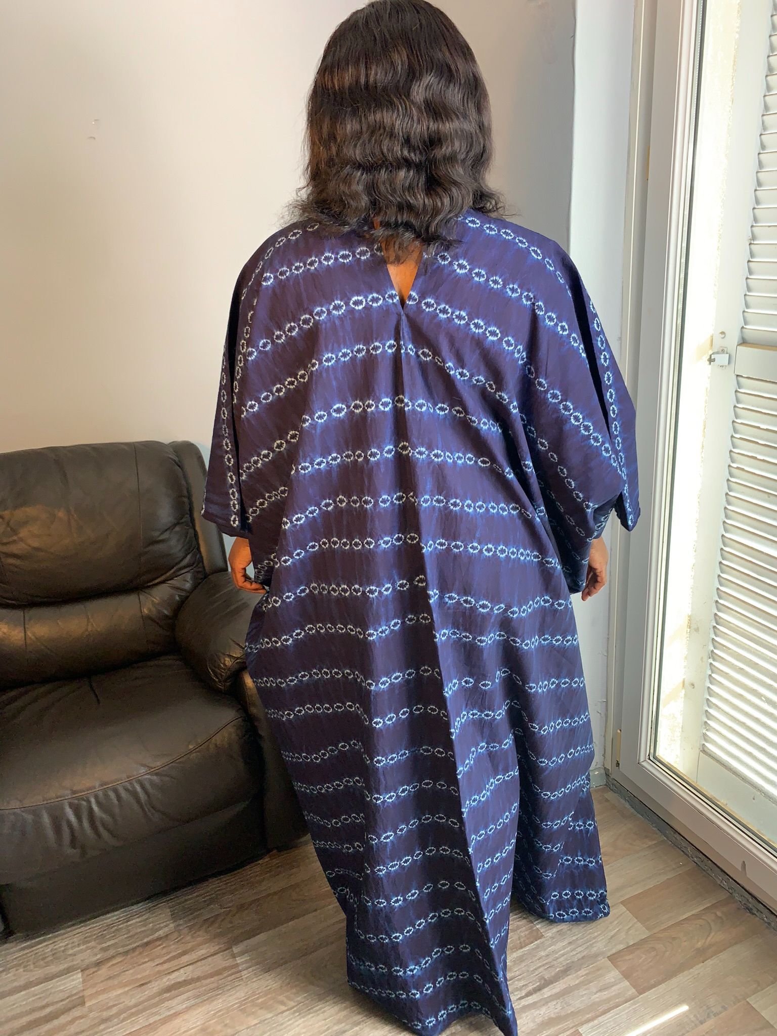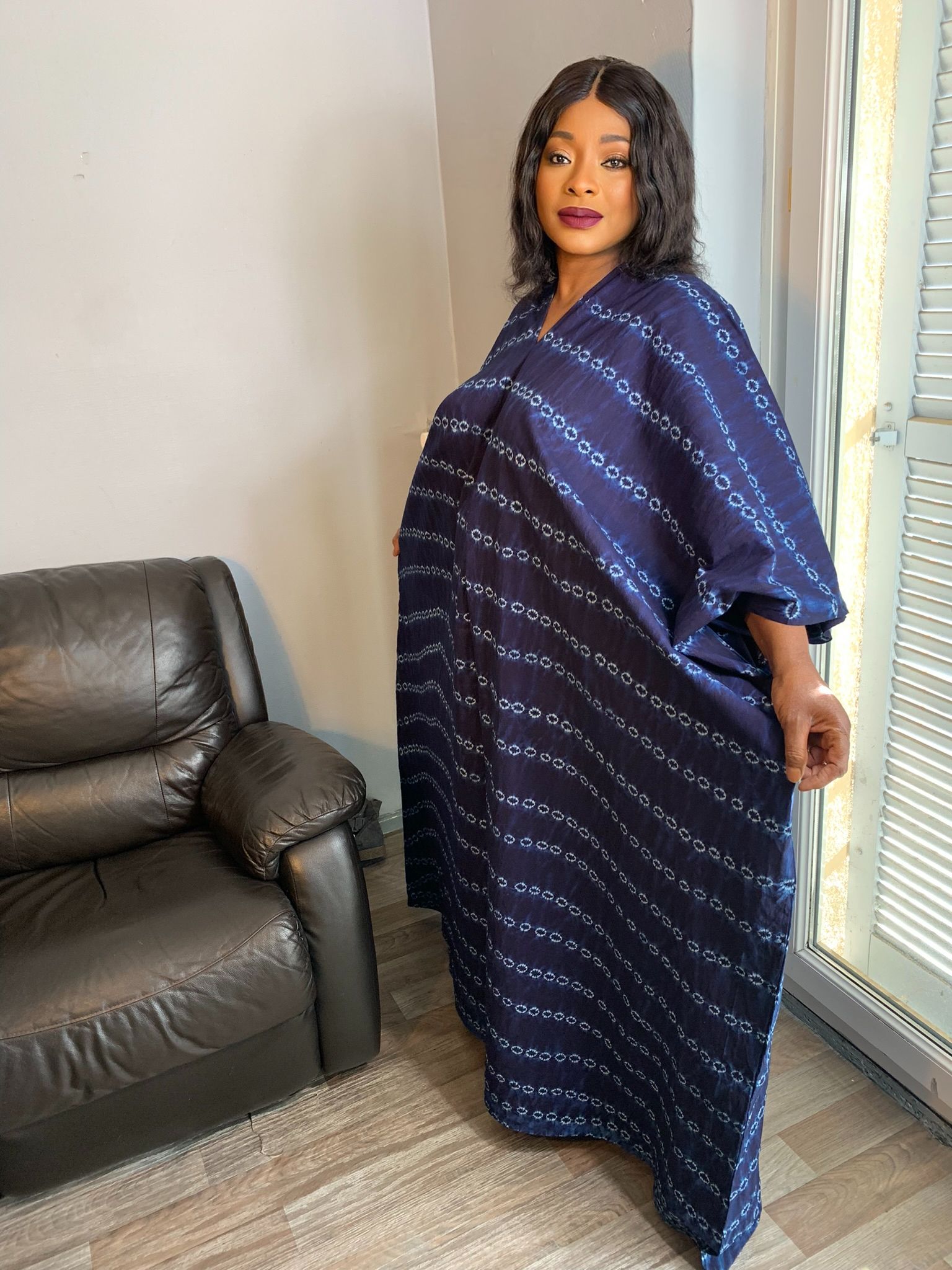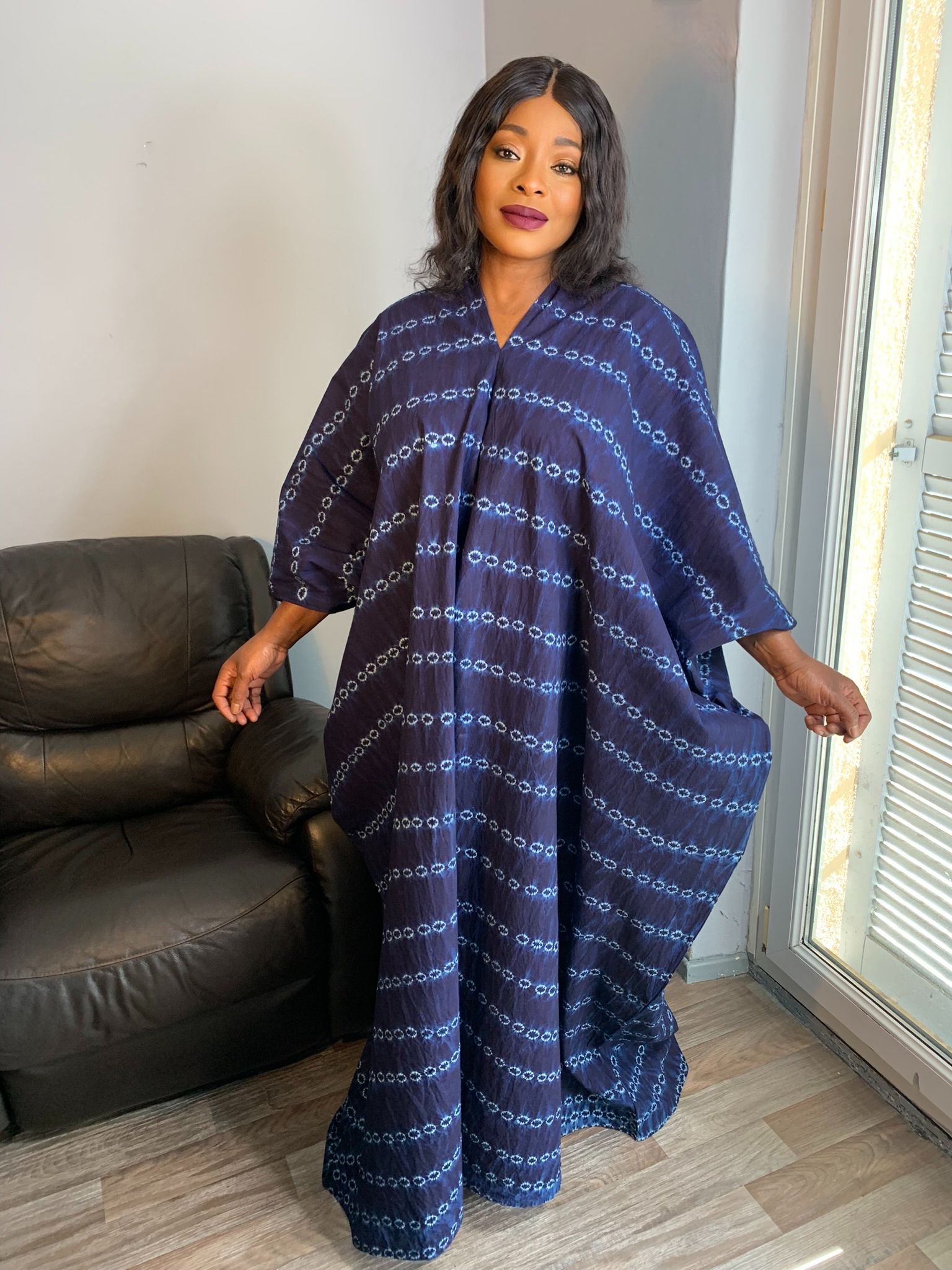 Mali Adire Blau-Indigo-Kleid. Sehr weiches Material aus 100 % Baumwolle. Natürlicher Farbstoff mit Indigoblättern.