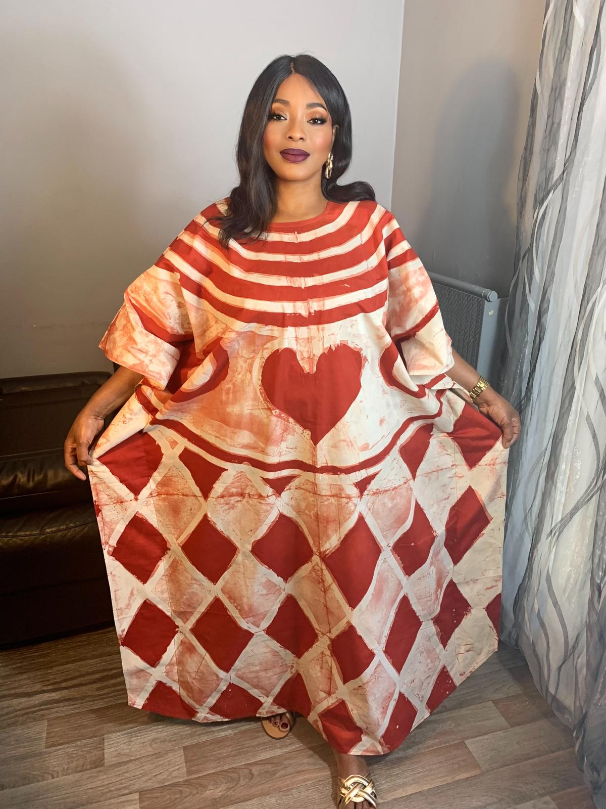 Dunkelrotes Batik-Adire-Langkleid mit Herzmuster, handgefertigt, 100 % Baumwolle