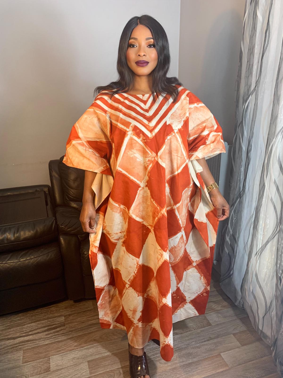 Langes Boubou-Batikkleid. Handgefärbt. Material: 100 % Baumwolle. Rundhalsausschnitt.