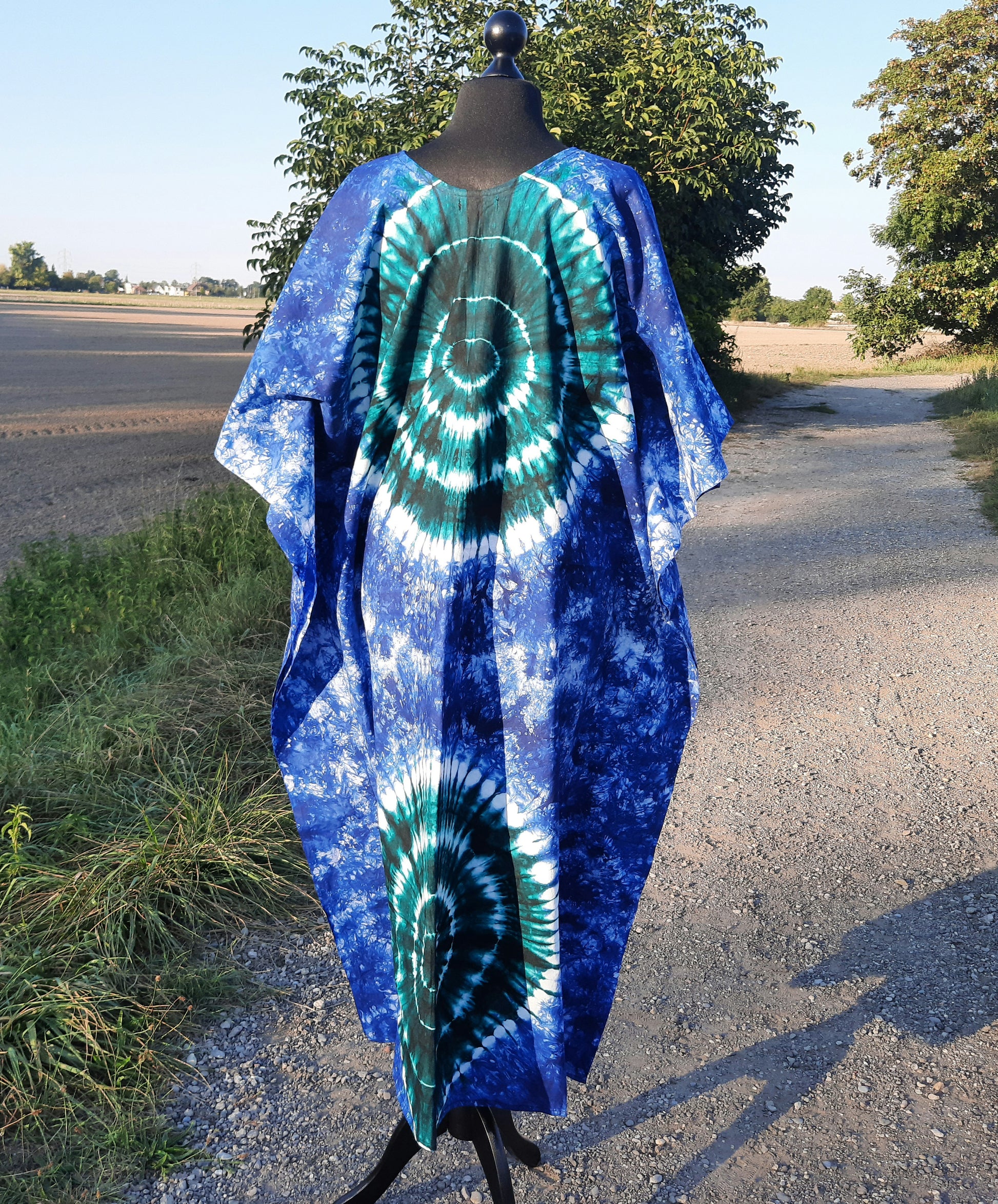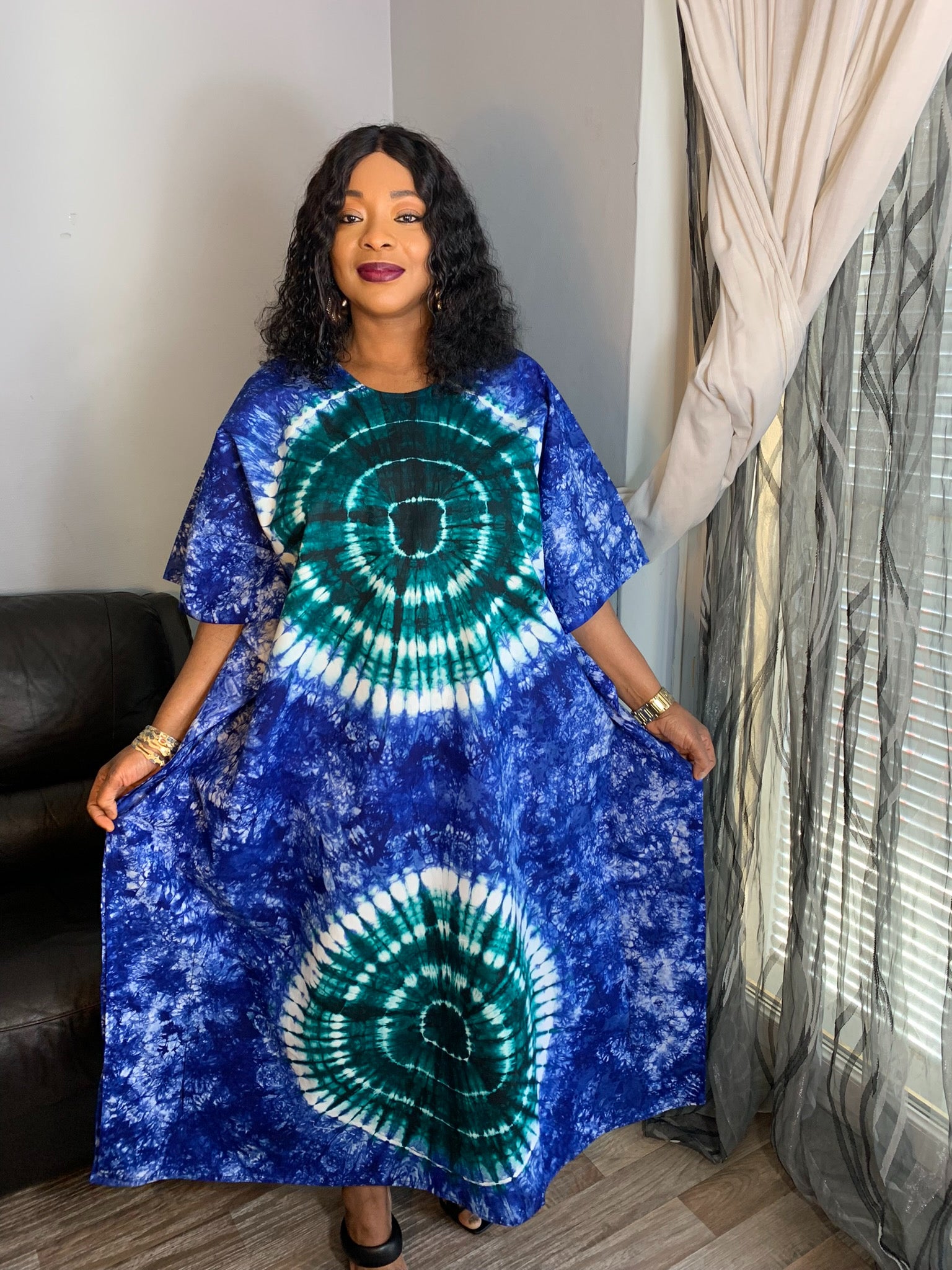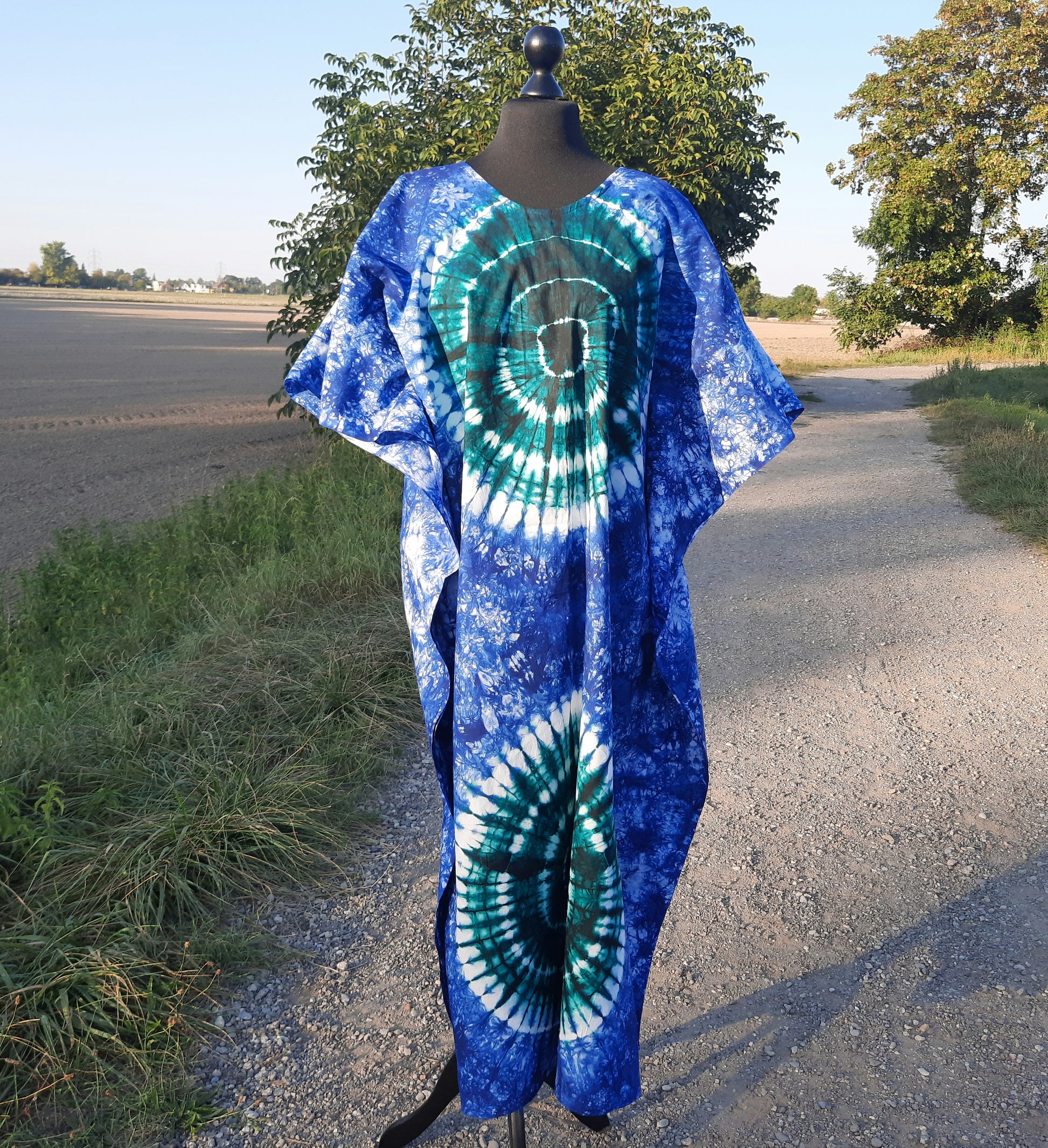 Langes Boubou-Batikkleid. Handgefärbt. Material: 100 % Baumwolle. Halsausschnitt mit Baumwolle gefüttert. Rundhalsausschnitt.
