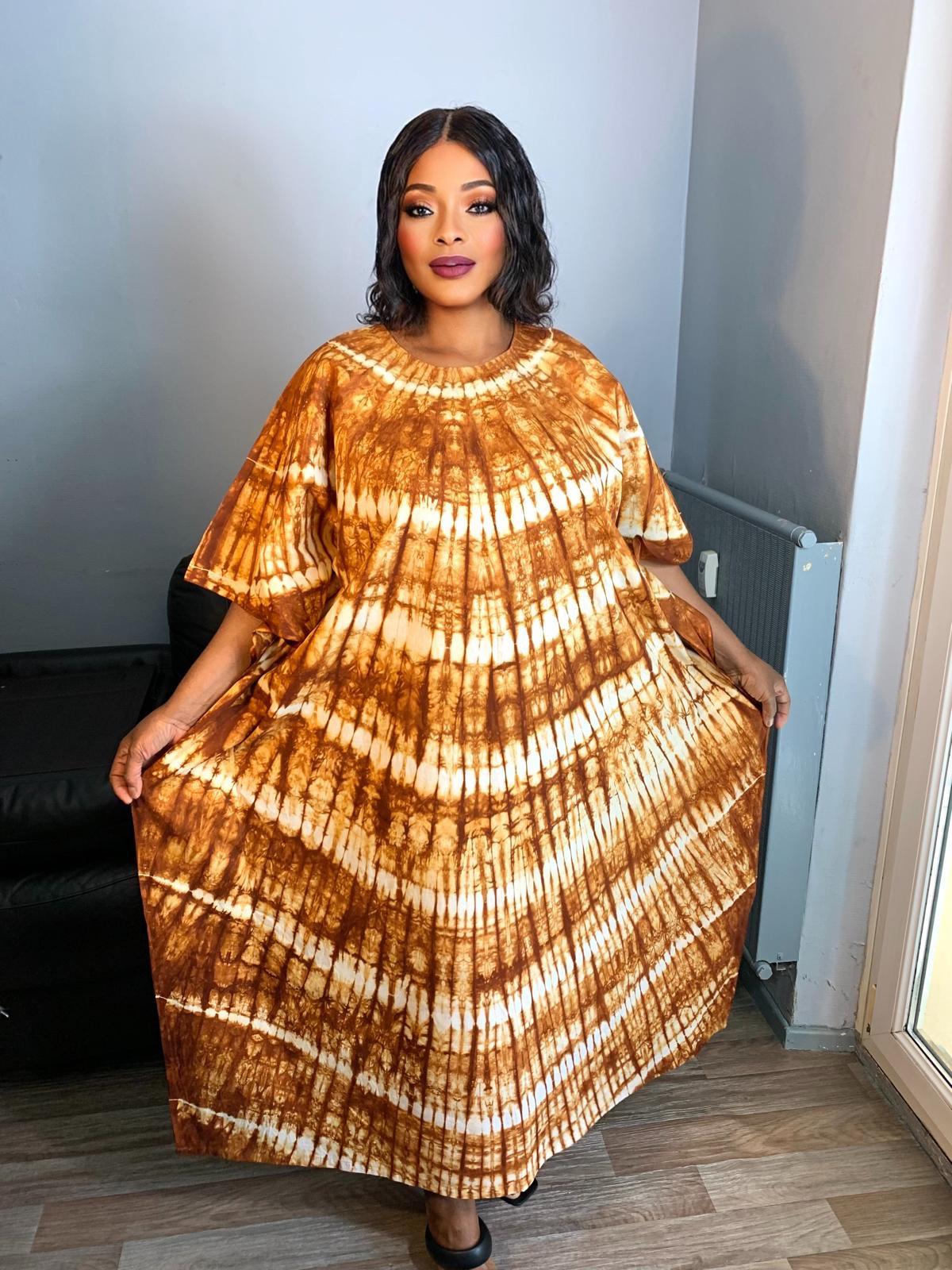 Langes Boubou-Batikkleid. Handgefärbt. Material: 100 % Baumwolle. Rundhalsausschnitt. In 1 Exemplar verfügbar.