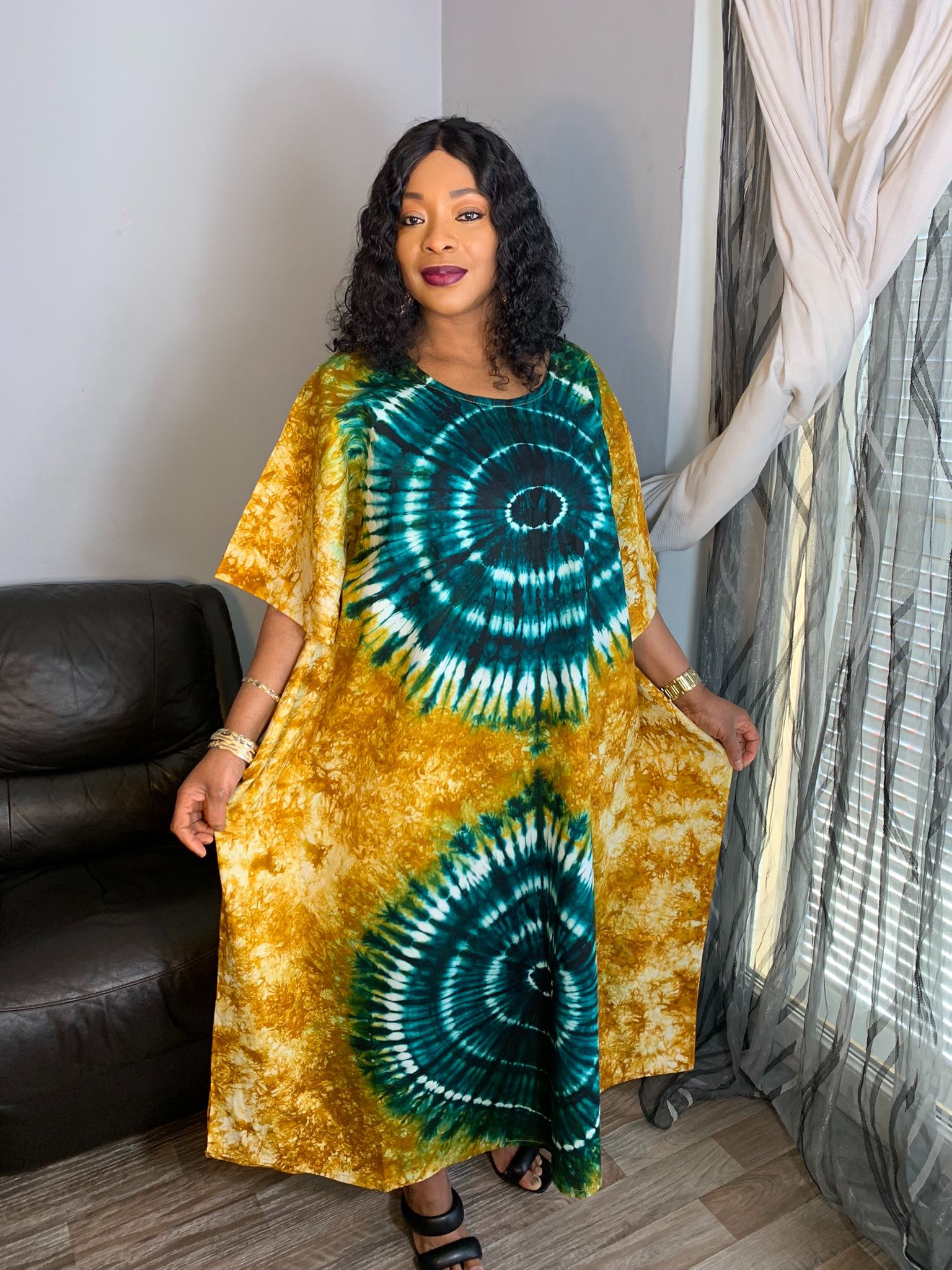 Langes Boubou-Batikkleid. Handgefärbt. Material: 100 % Baumwolle. Halsausschnitt mit Baumwolle gefüttert. Rundhalsausschnitt.