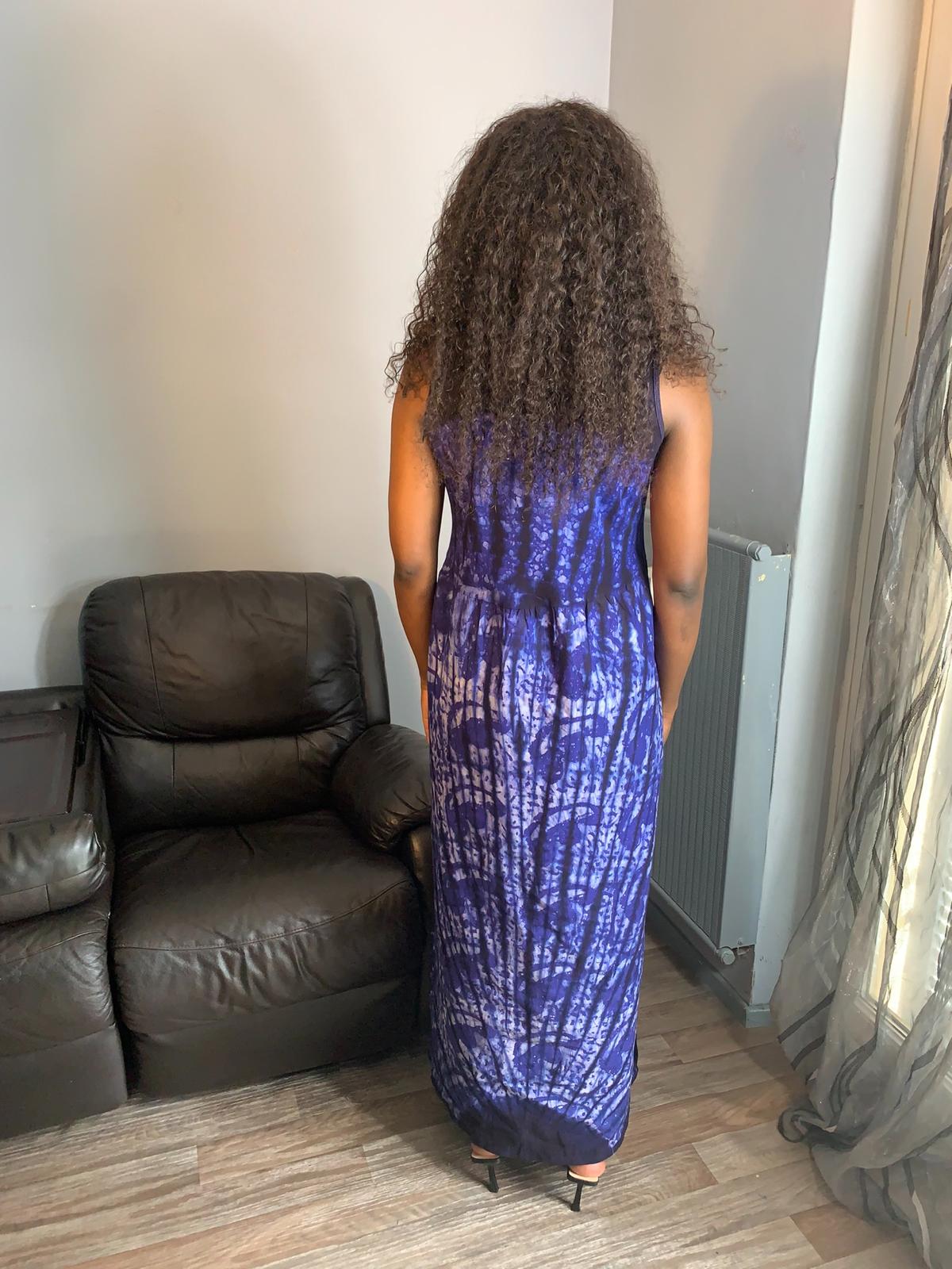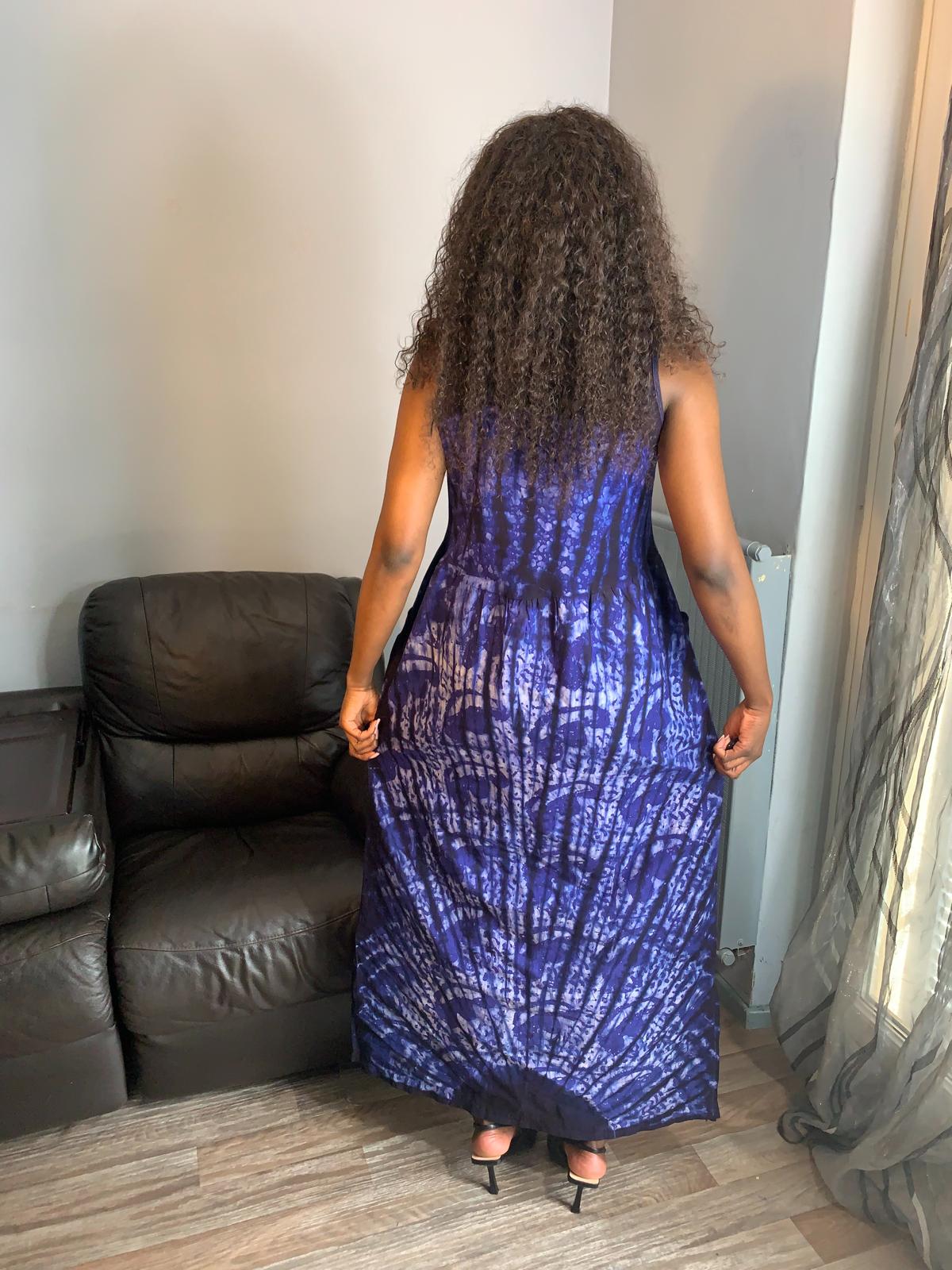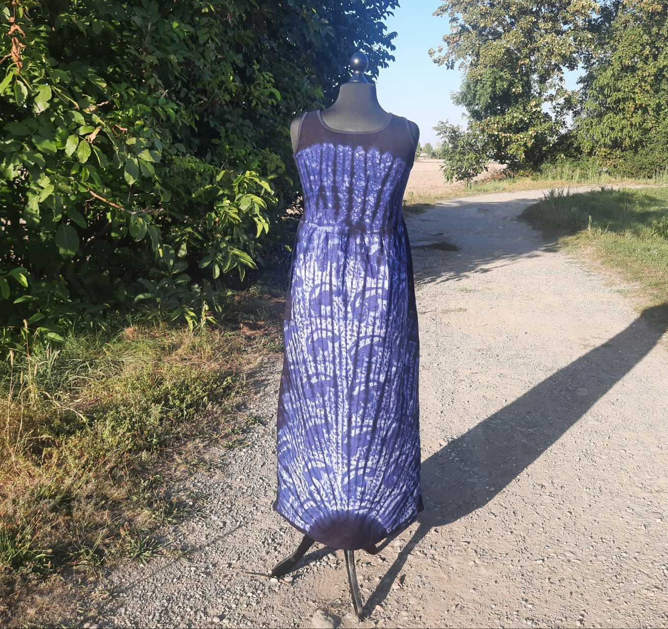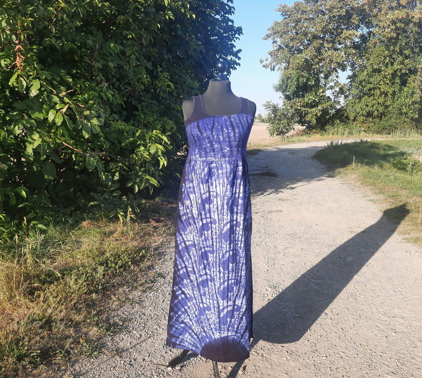 T-Shirt-Kleid im Indigo-Batik-Stil. Material 100 %. Handgefärbte T-Shirts mit einem sehr, sehr langen handgefärbten Rock. Wir stellen unsere T-Shirts nicht selbst her, wir kaufen sie: blank weiß und färben sie von Hand; Wir nähen unsere extralangen Röcke von Hand und stellen sie für Sie zusammen.