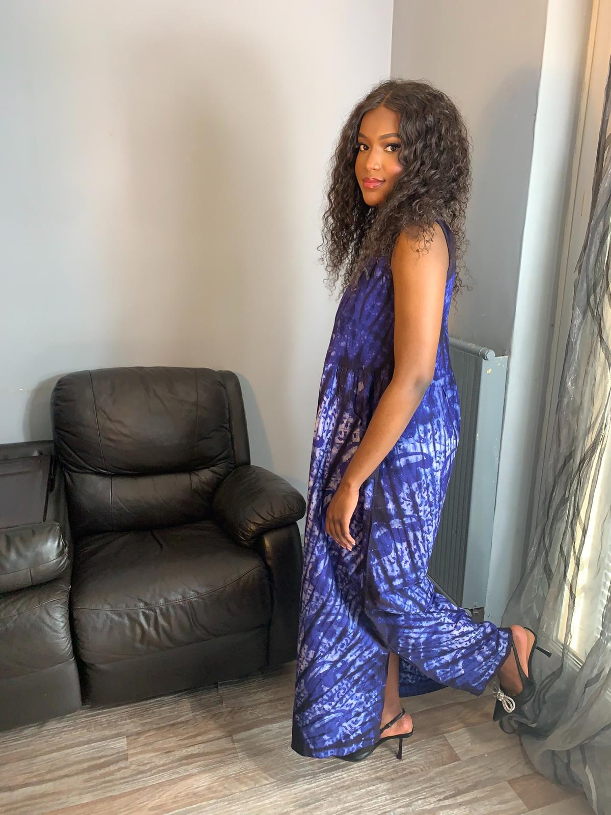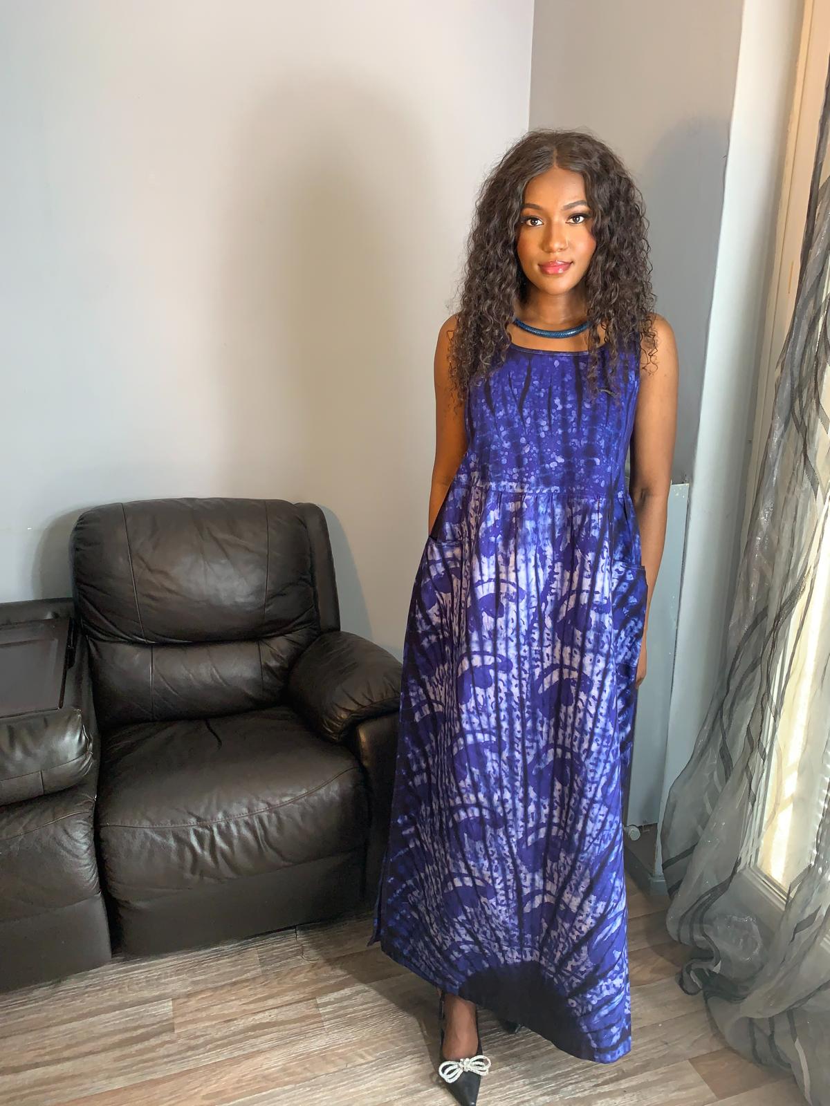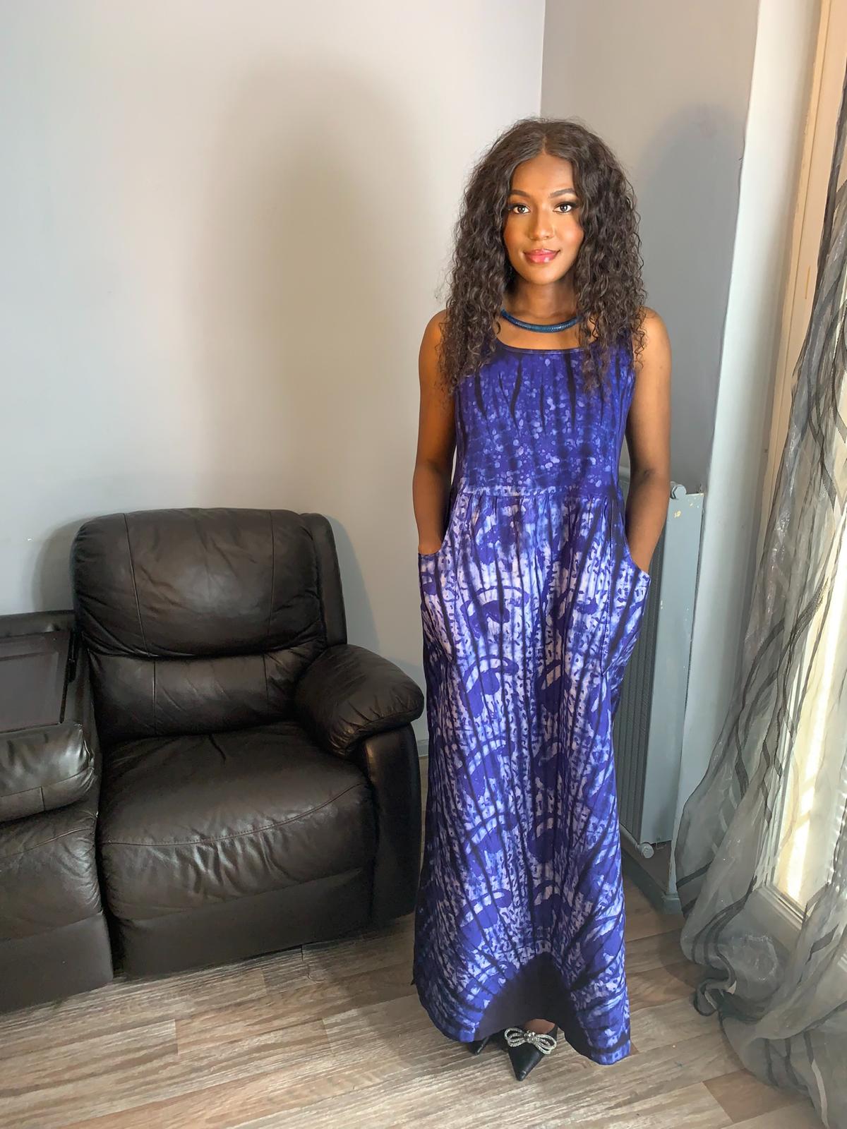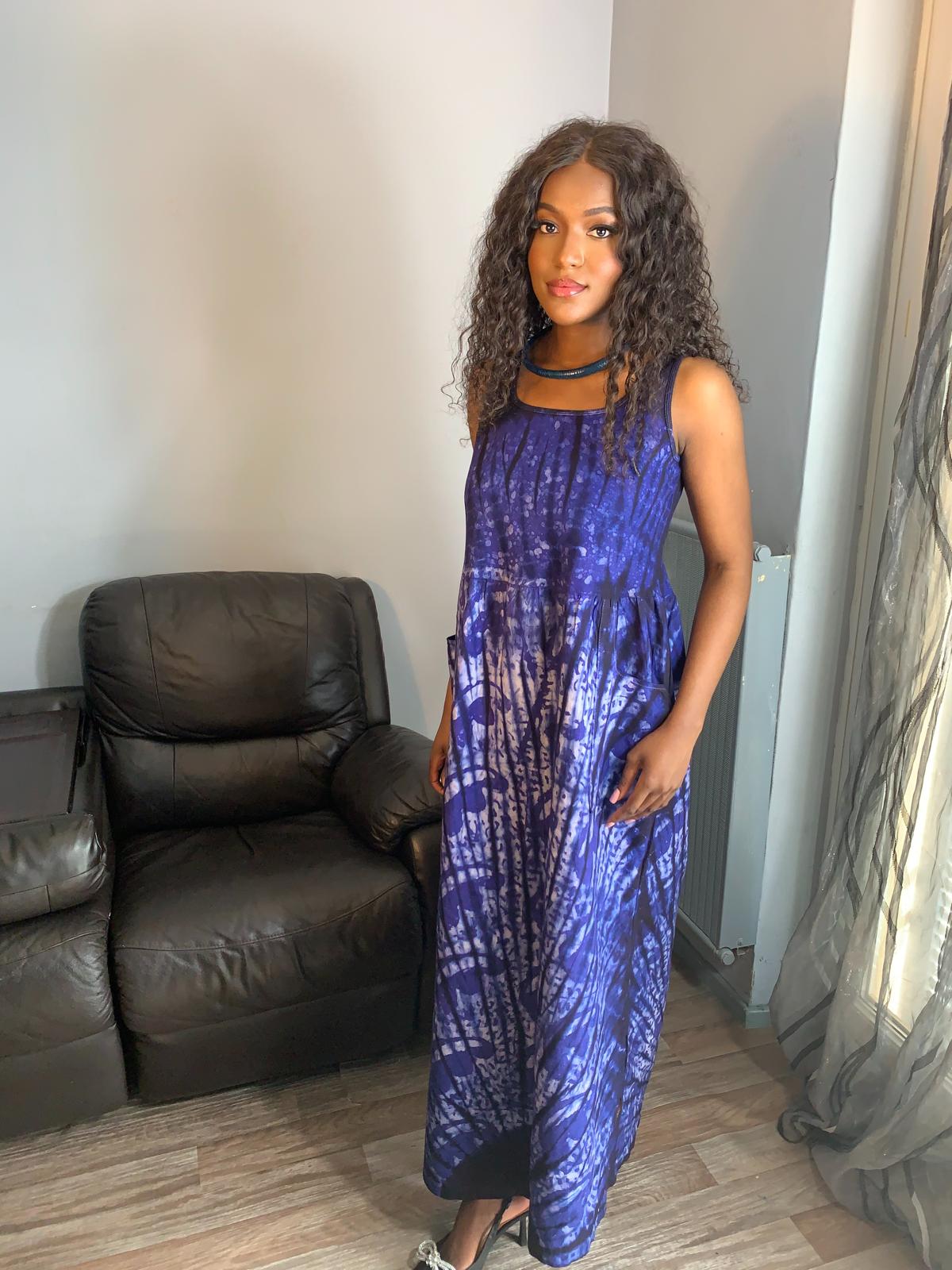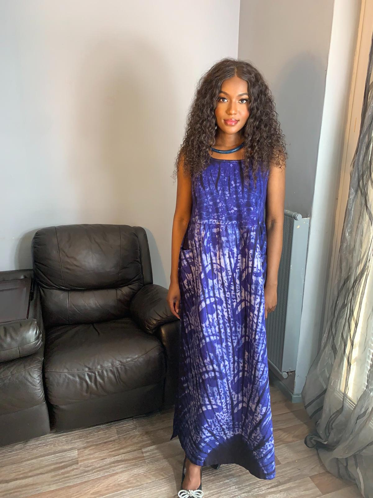 T-Shirt-Kleid im Indigo-Batik-Stil. Material 100 %. Handgefärbte T-Shirts mit einem sehr, sehr langen handgefärbten Rock. Wir stellen unsere T-Shirts nicht selbst her, wir kaufen sie: blank weiß und färben sie von Hand; Wir nähen unsere extralangen Röcke von Hand und stellen sie für Sie zusammen.