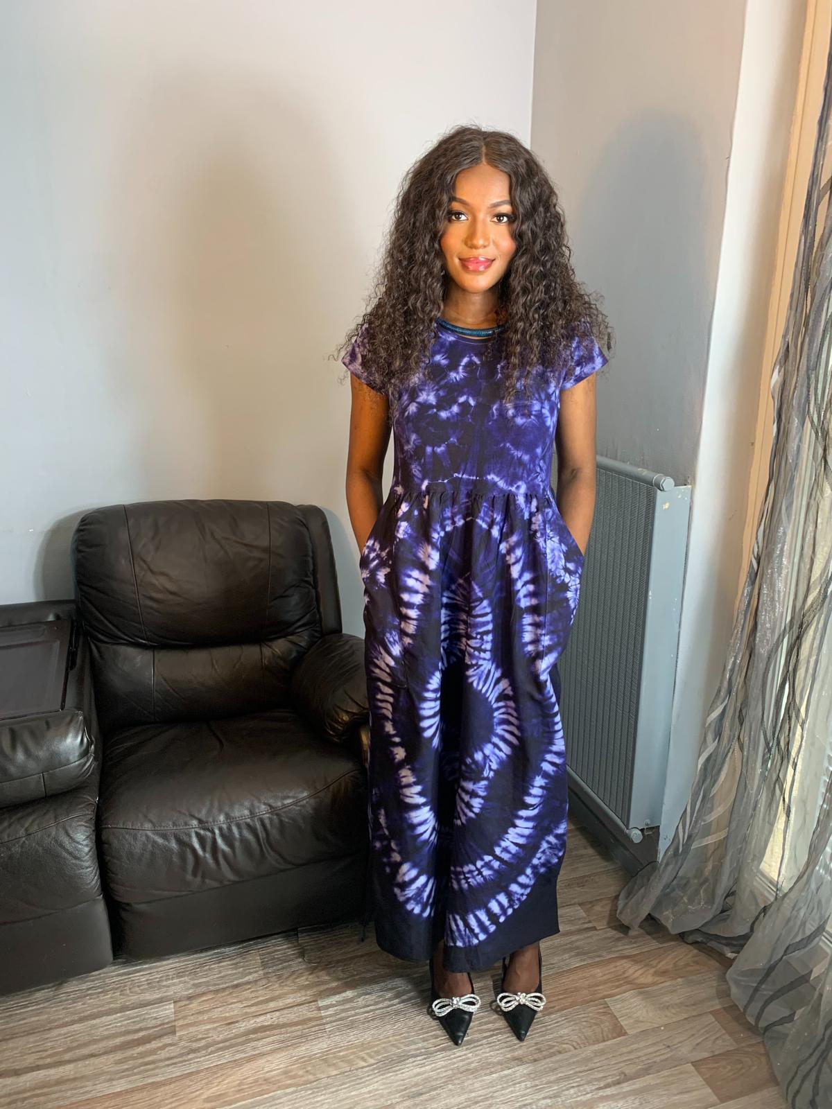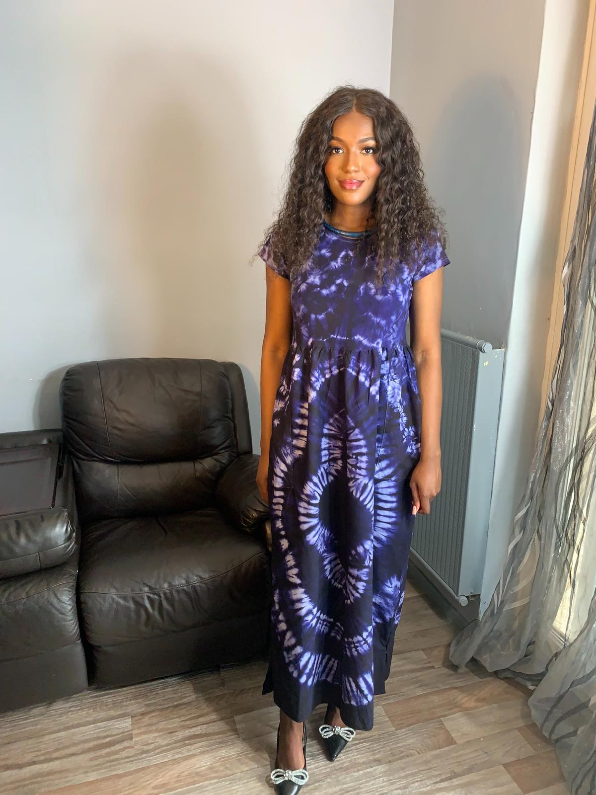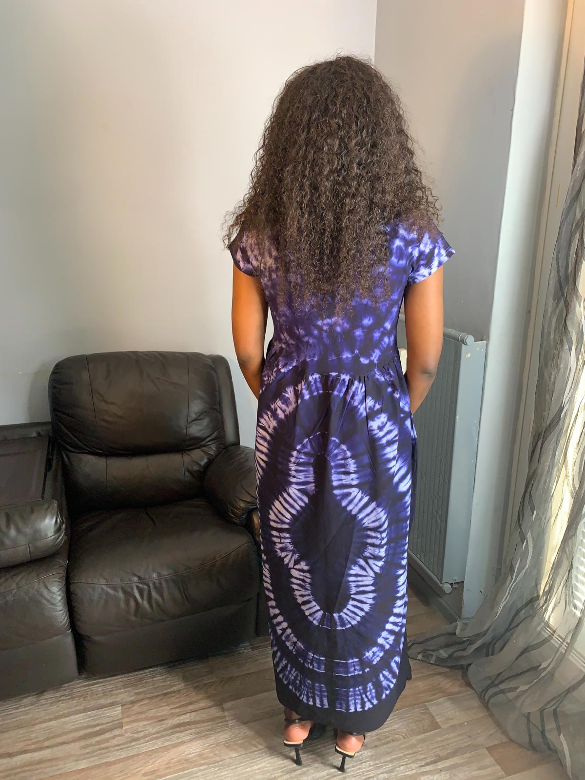 T-Shirt-Kleid im Indigo-Batik-Stil. Material 100 %. Handgefärbte T-Shirts mit einem sehr, sehr langen handgefärbten Rock. Wir stellen unsere T-Shirts nicht selbst her, wir kaufen sie: blank weiß und färben sie von Hand; Wir nähen unsere extralangen Röcke von Hand und stellen sie für Sie zusammen.