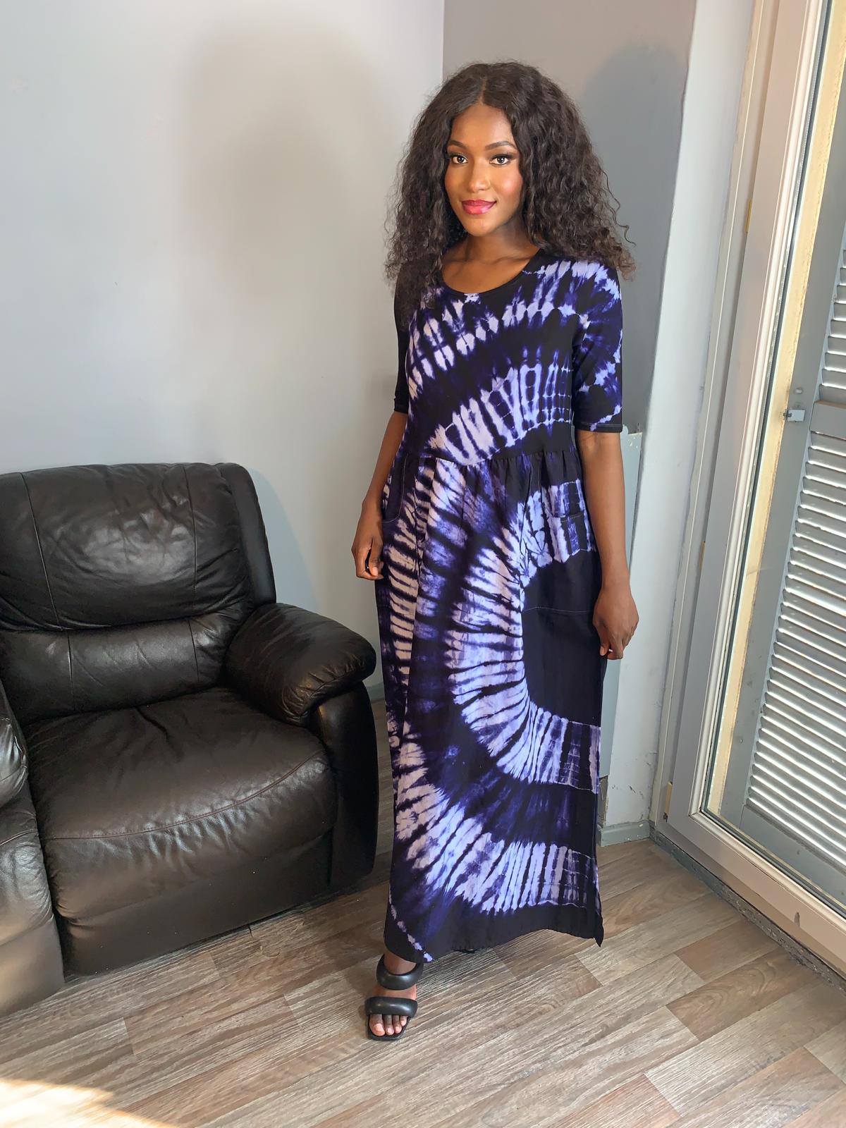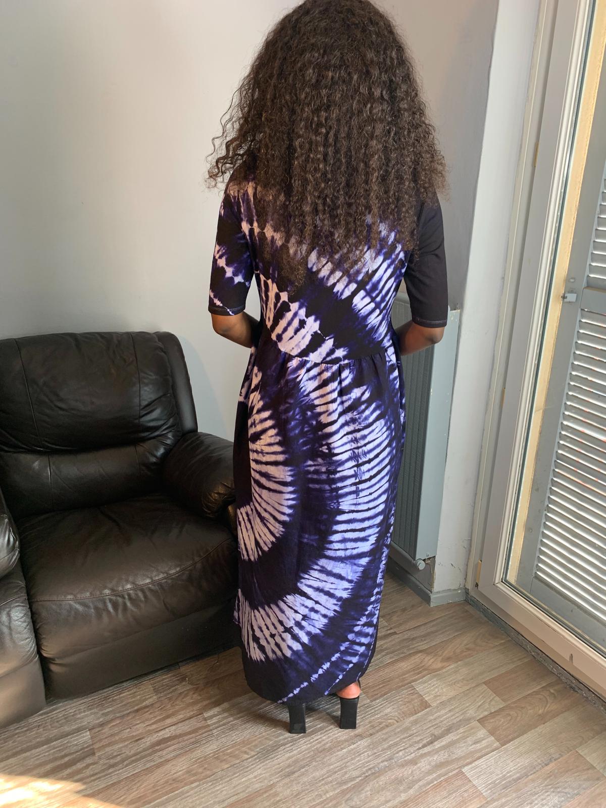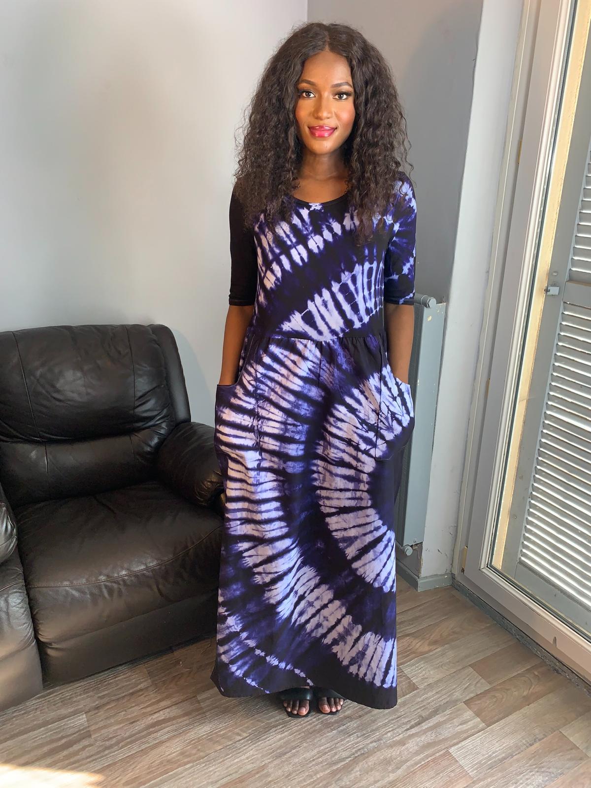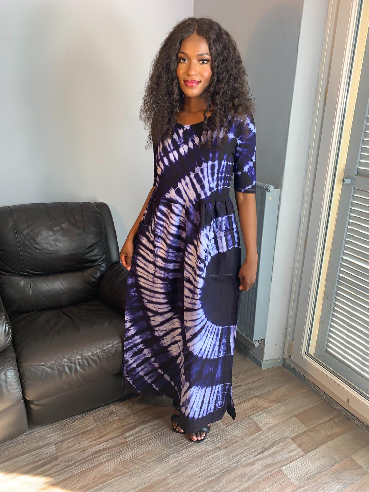 T-Shirt-Kleid im Indigo-Batik-Stil. Material 100 %. Handgefärbte T-Shirts mit einem sehr, sehr langen handgefärbten Rock. Wir stellen unsere T-Shirts nicht selbst her, wir kaufen sie: blank weiß und färben sie von Hand; Wir nähen unsere extralangen Röcke von Hand und stellen sie für Sie zusammen. Enthält 2 Taschen