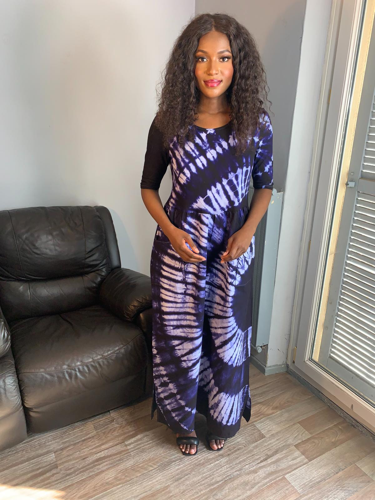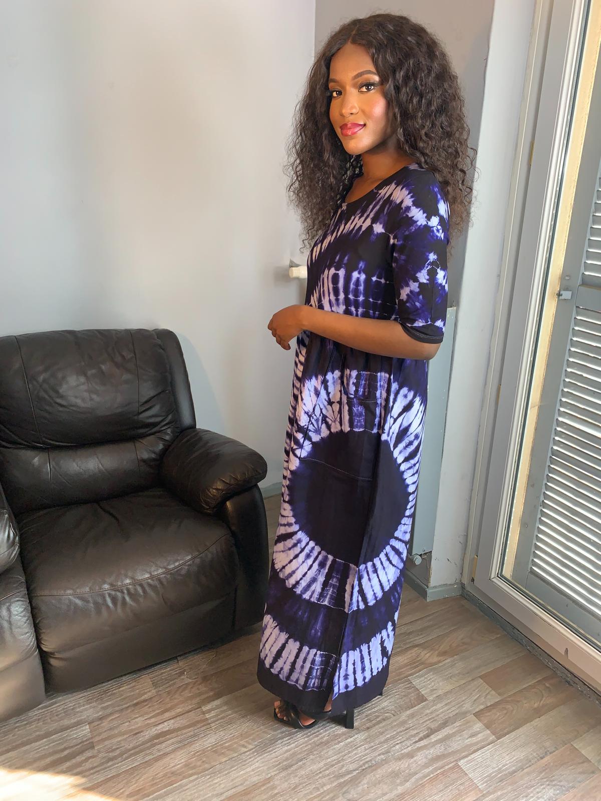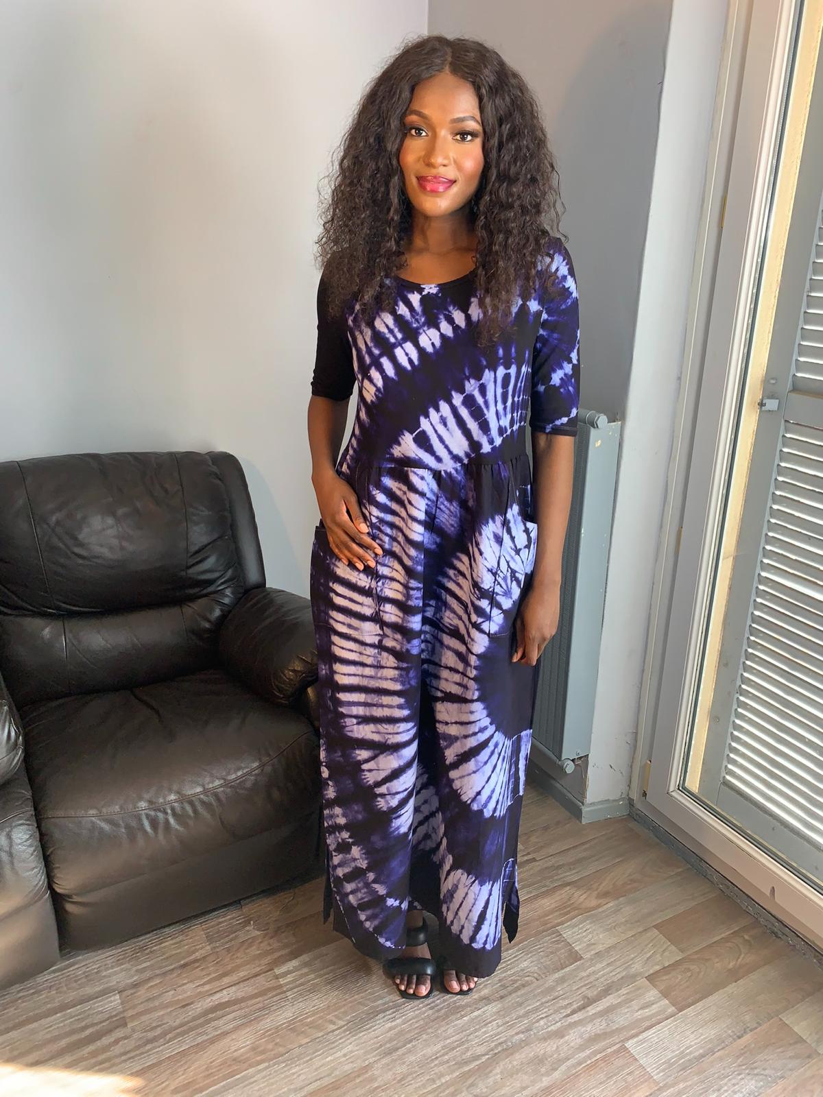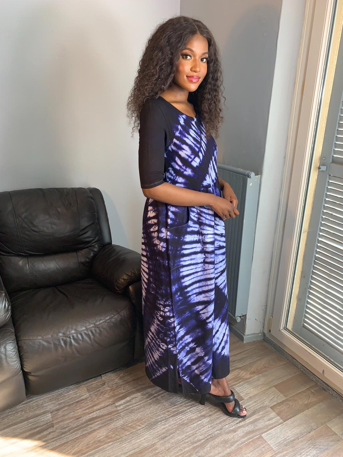 T-Shirt-Kleid im Indigo-Batik-Stil. Material 100 %. Handgefärbte T-Shirts mit einem sehr, sehr langen handgefärbten Rock. Wir stellen unsere T-Shirts nicht selbst her, wir kaufen sie: blank weiß und färben sie von Hand; Wir nähen unsere extralangen Röcke von Hand und stellen sie für Sie zusammen. Enthält 2 Taschen