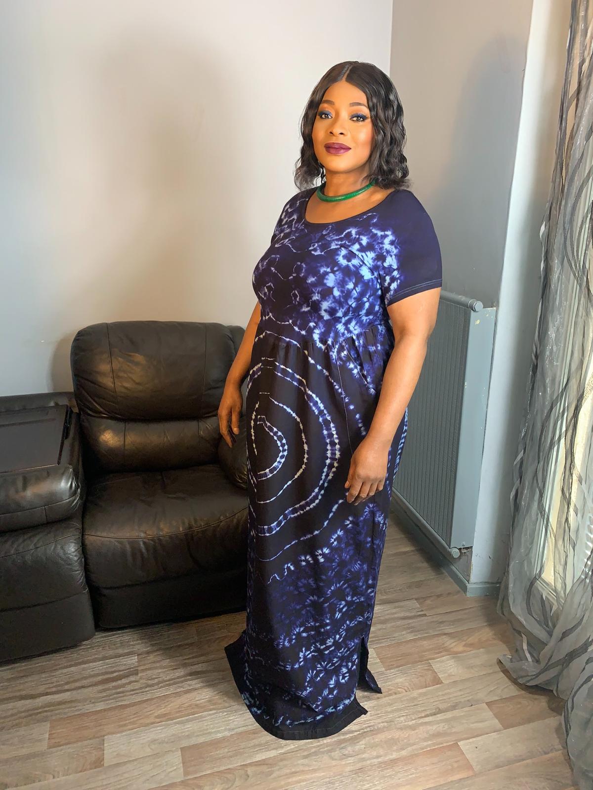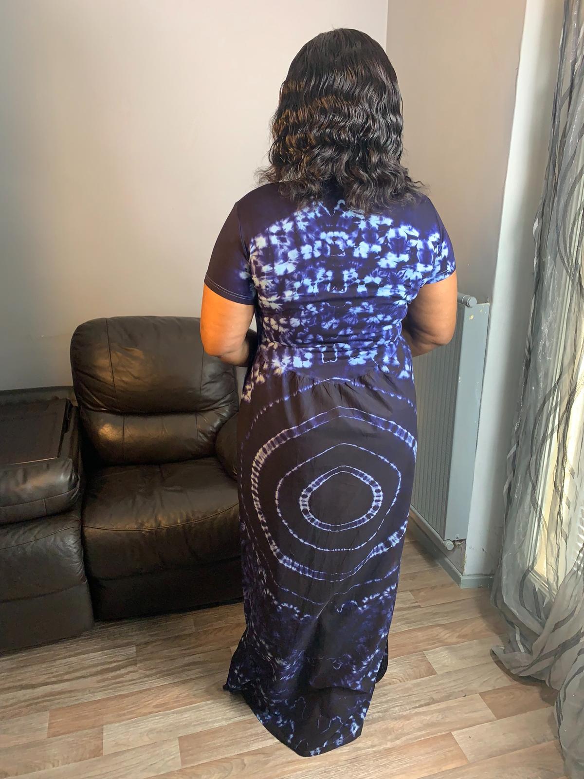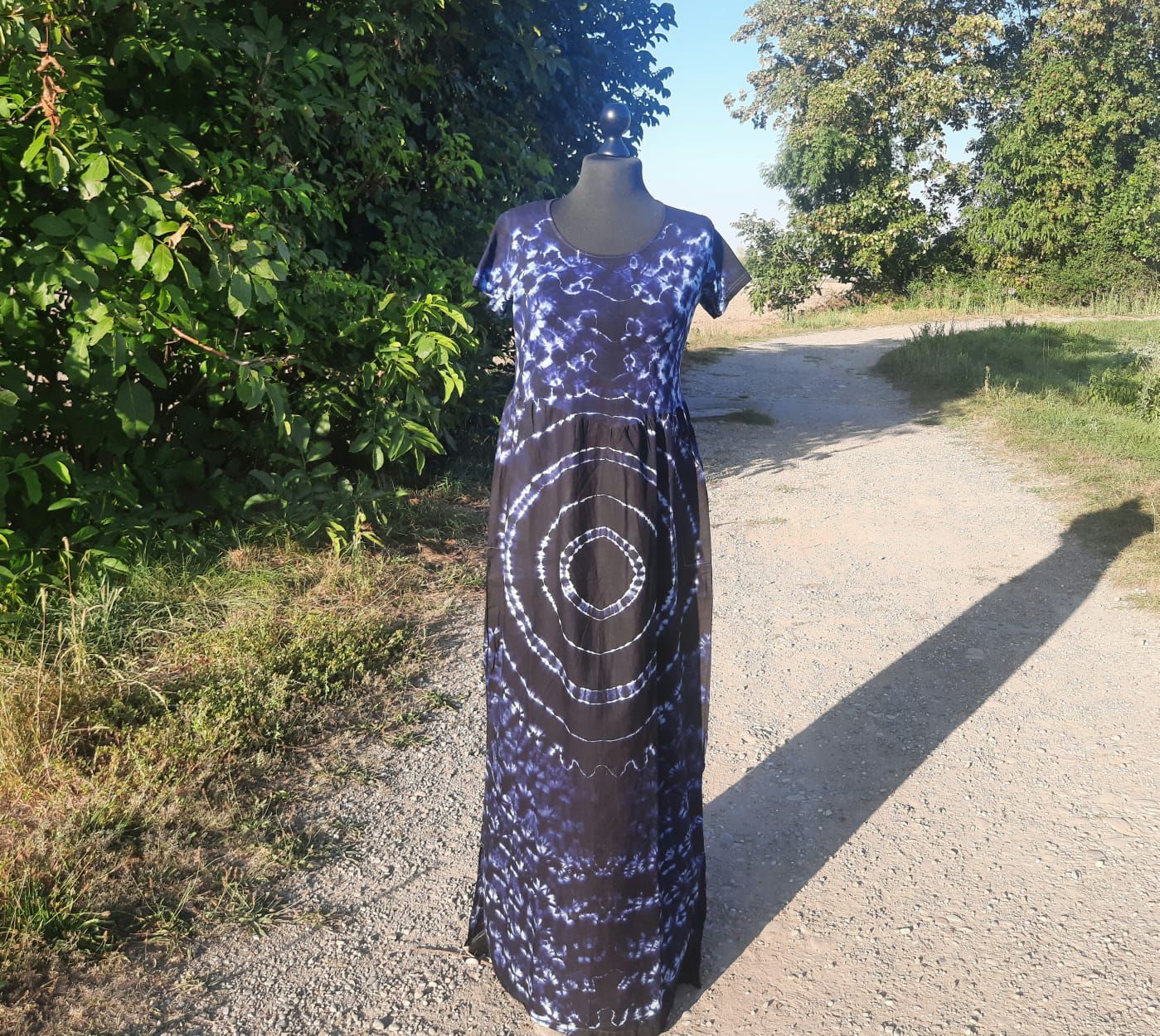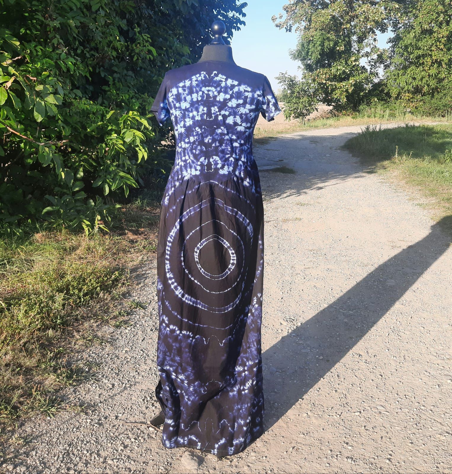 T-Shirt-Kleid im Indigo-Batik-Stil. Elastanmaterial für das T-Shirt und Baumwolle für den Rock. Handgefärbte T-Shirts mit einem sehr, sehr langen handgefärbten Rock. Wir stellen unsere T-Shirts nicht selbst her, wir kaufen sie: blank weiß und färben sie von Hand; Wir nähen unsere extralangen Röcke von Hand und stellen sie für Sie zusammen.
