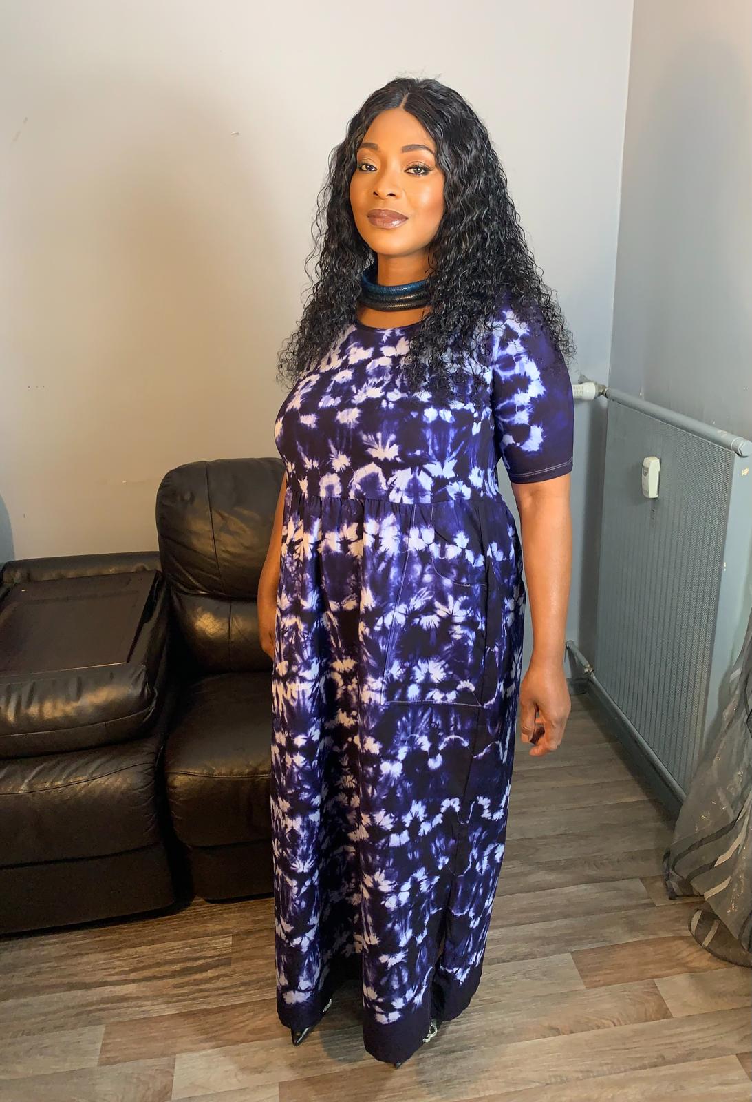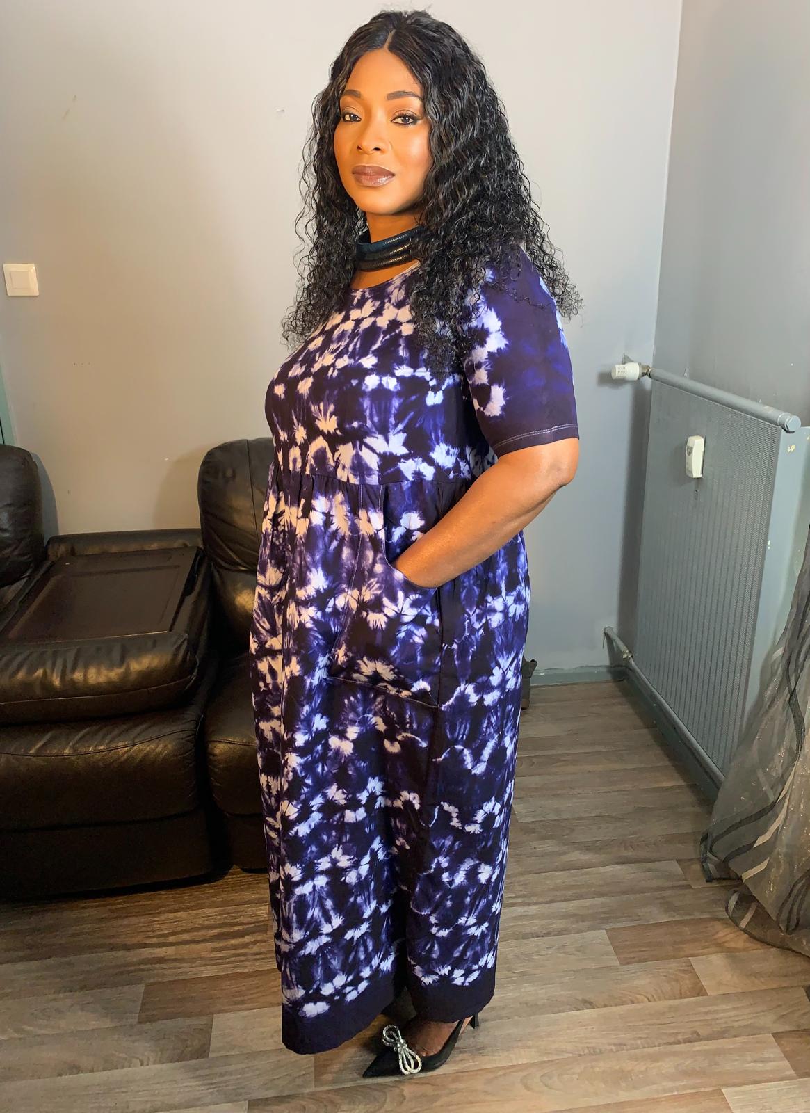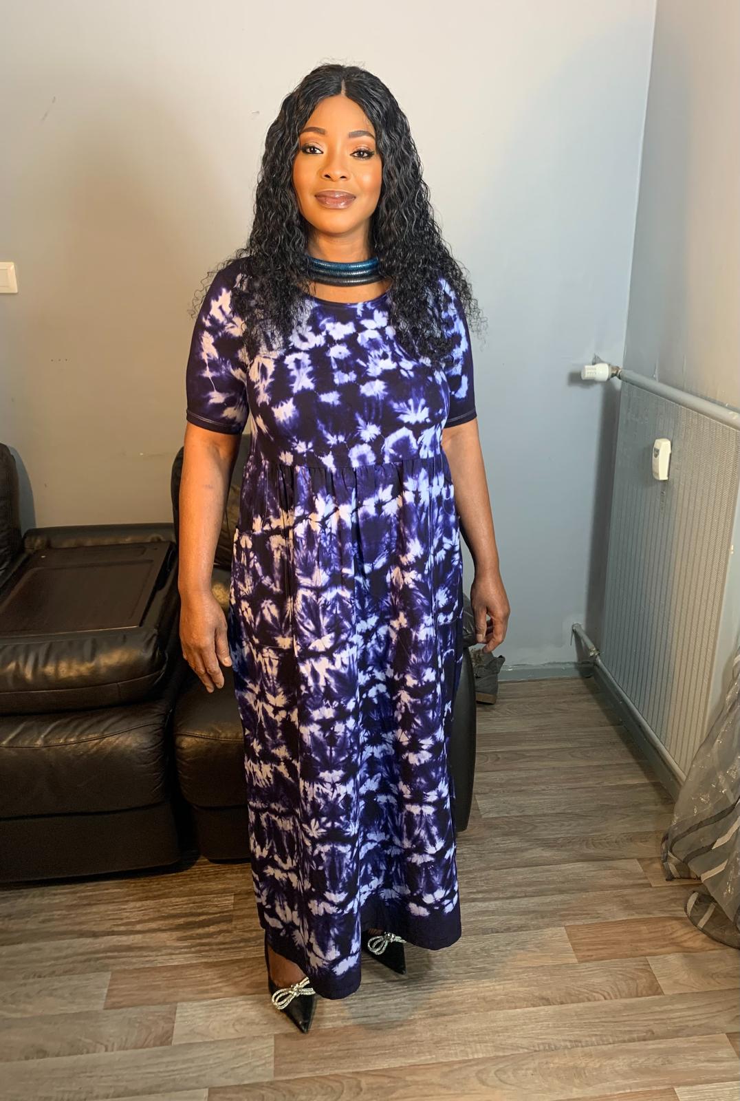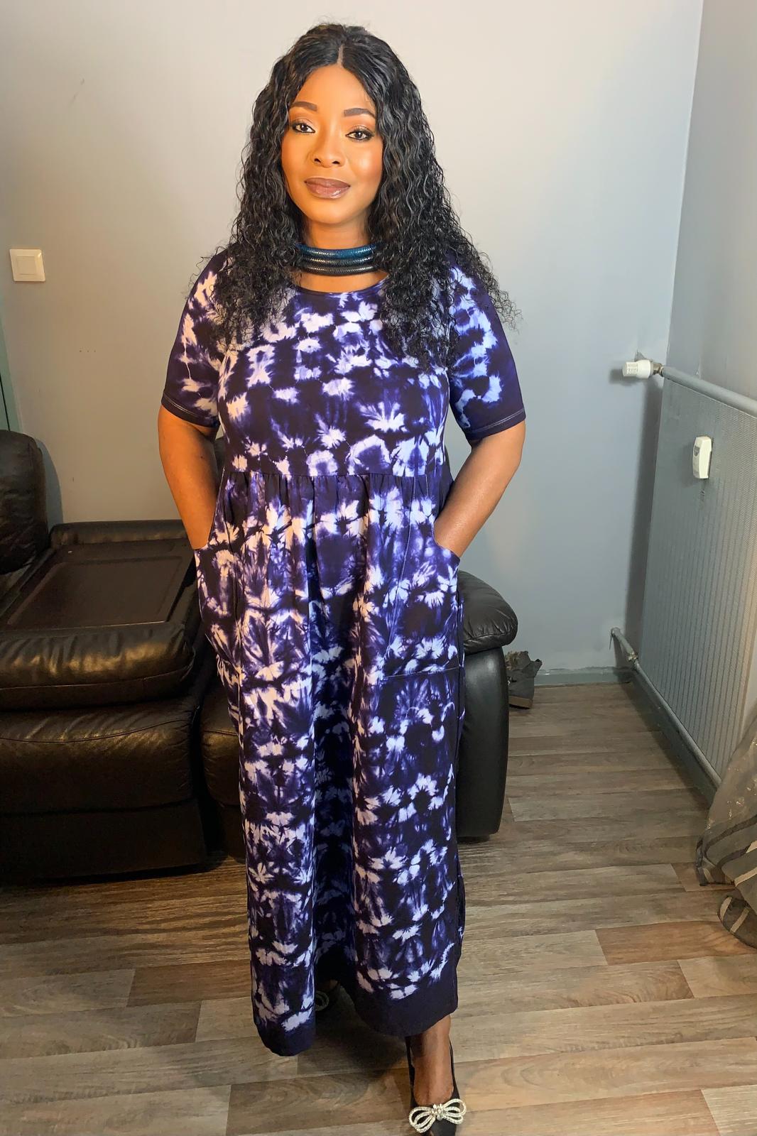 Indigoblaues T-Shirt-Kleid, Batikmuster, sehr weiche Baumwolle.
