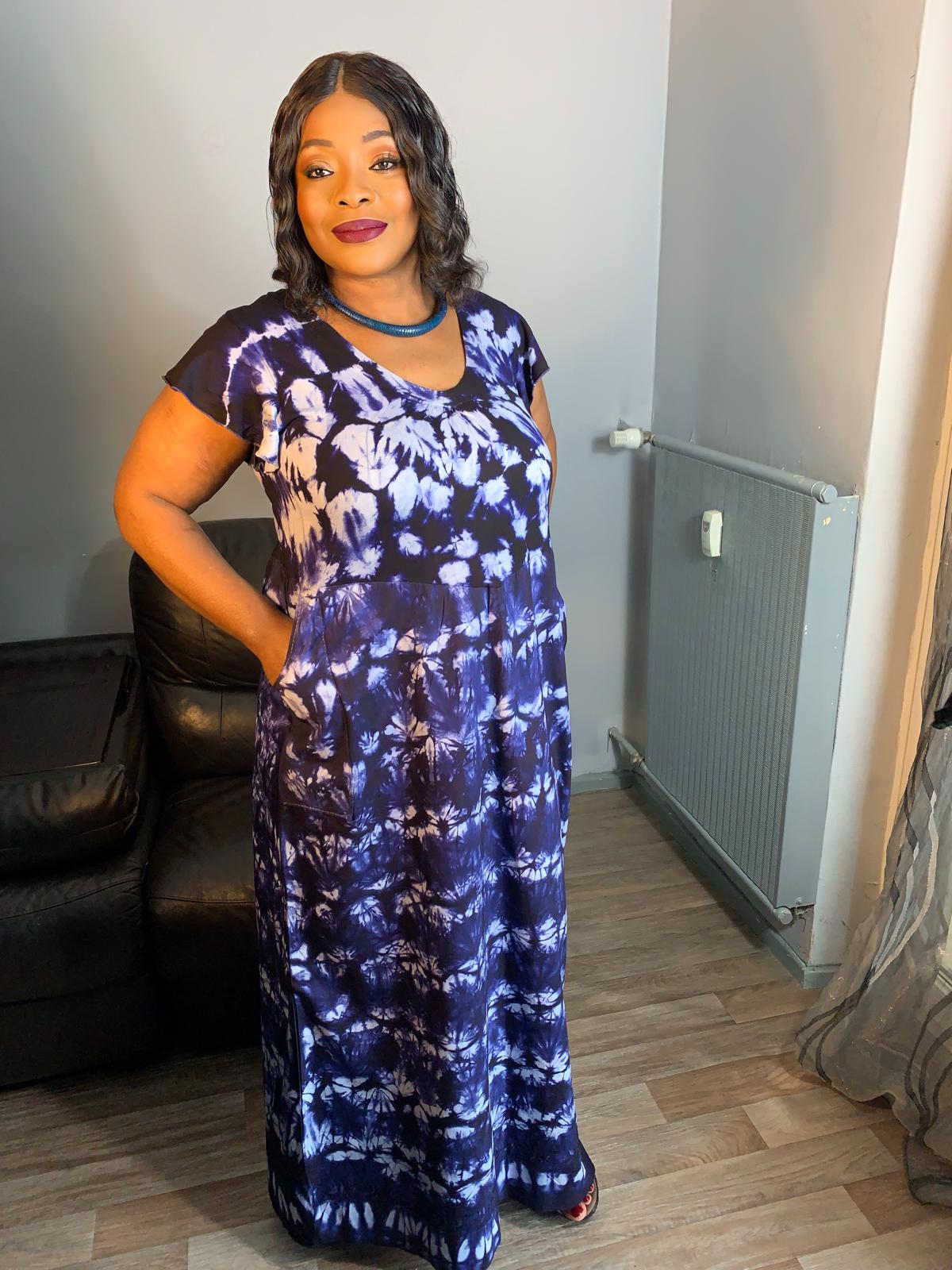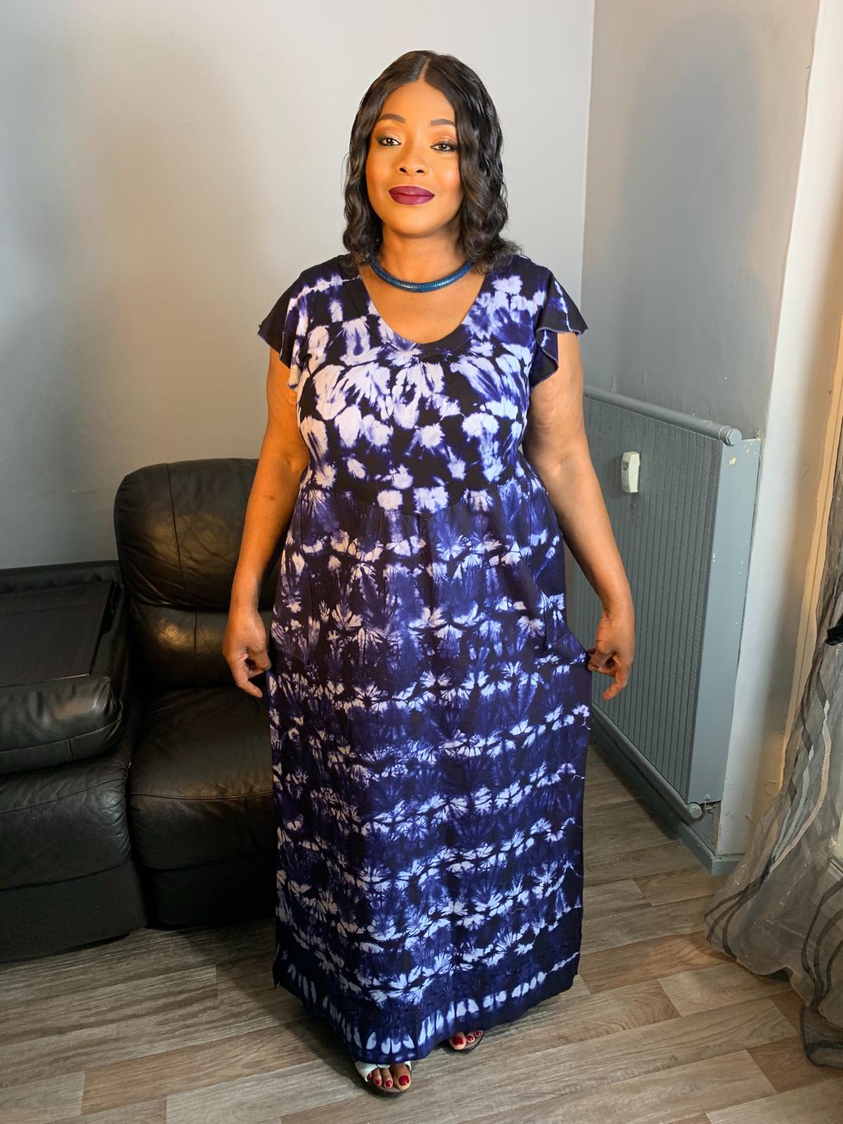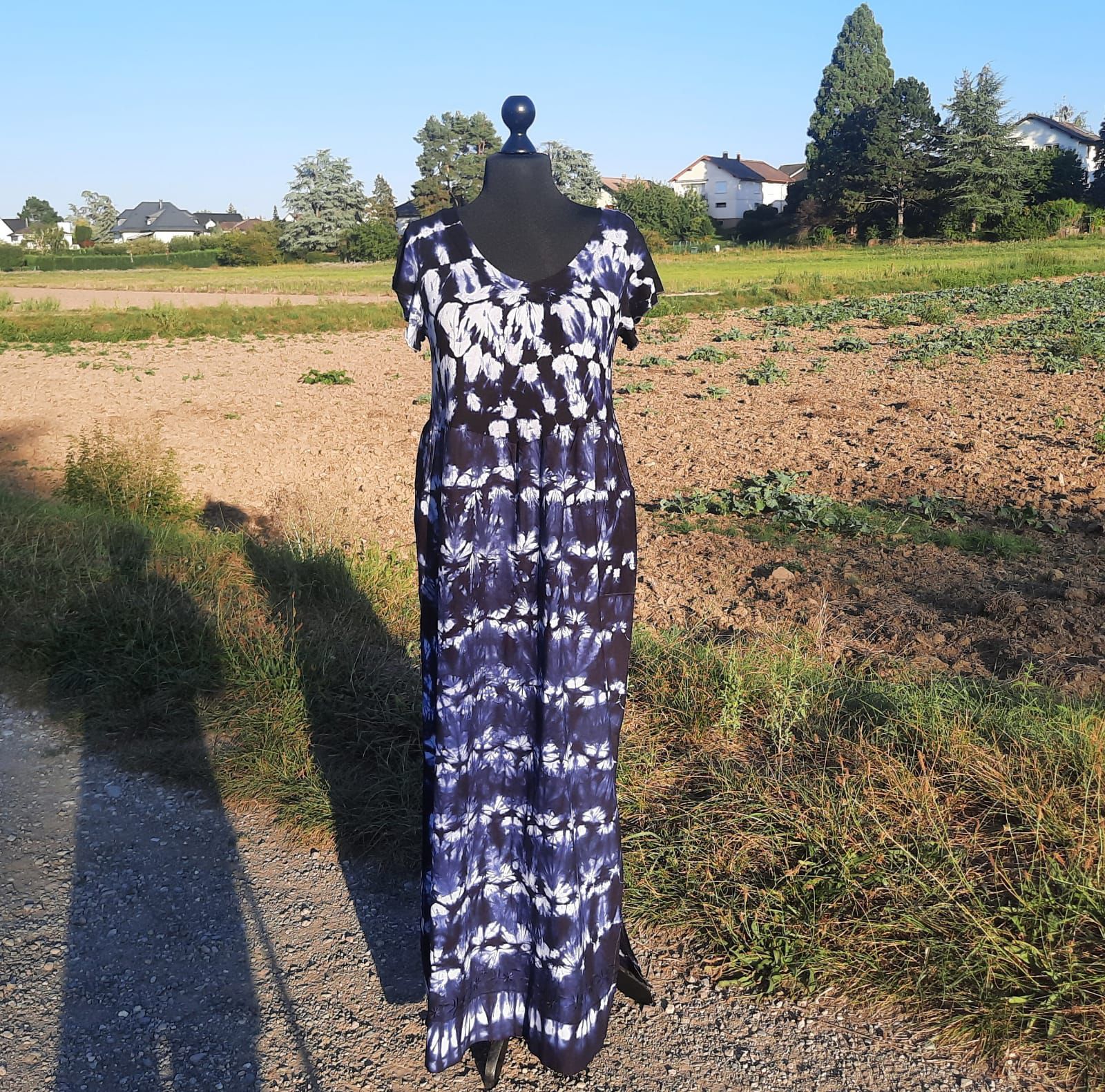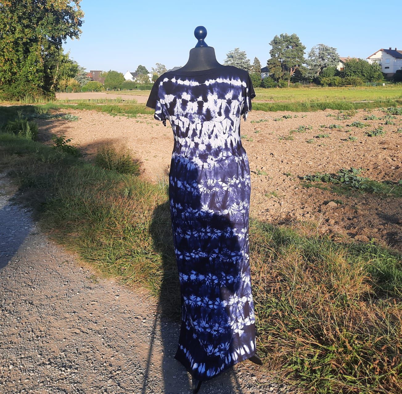 T-Shirt-Kleid im Indigo-Batik-Stil. Elastanmaterial für das T-Shirt und Baumwolle für den Rock. Handgefärbte T-Shirts mit einem sehr langen, sehr langen handgefärbten Rock. Wir stellen unsere T-Shirts nicht selbst her, wir kaufen sie: blank weiß und färben sie von Hand; Wir nähen unsere extralangen Röcke von Hand und stellen sie für Sie zusammen. V-Ausschnitt