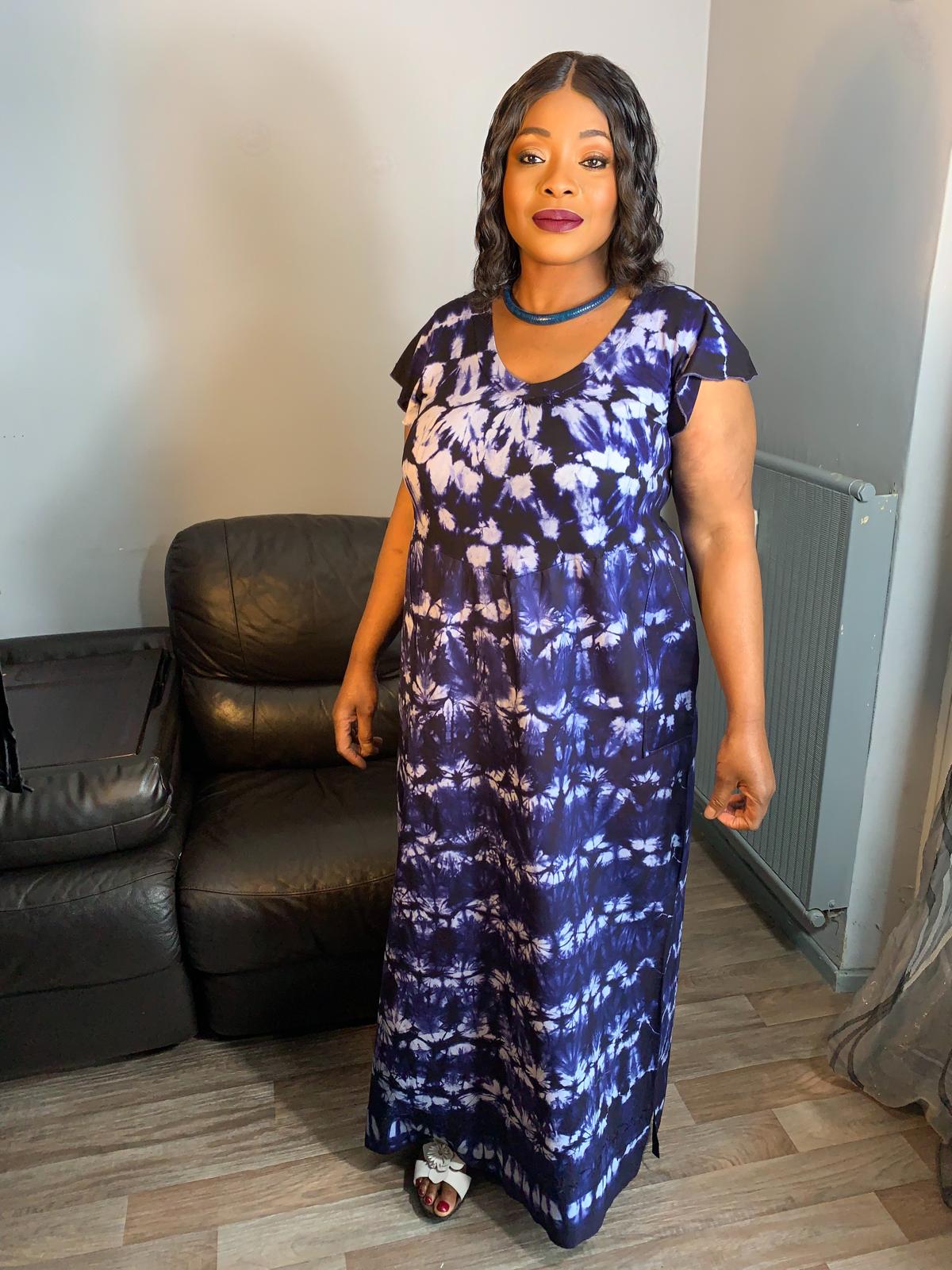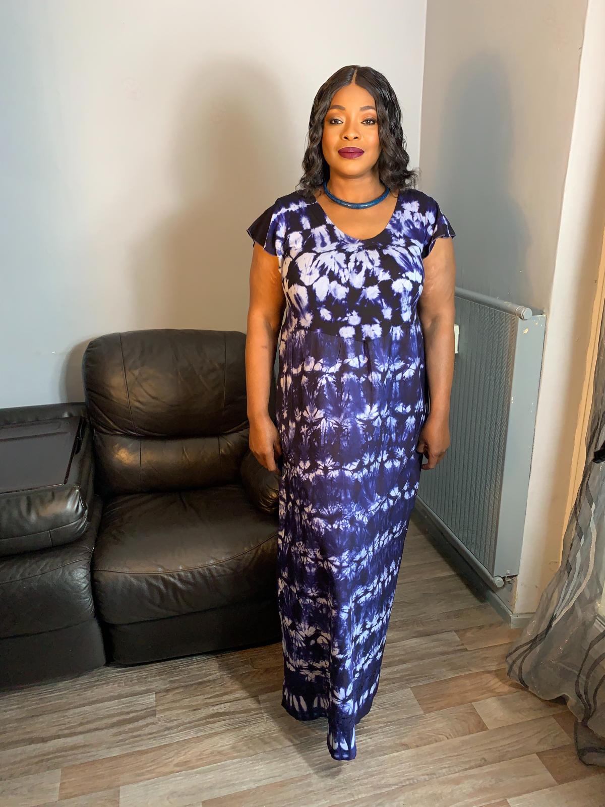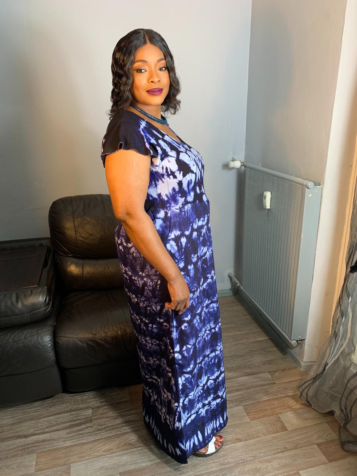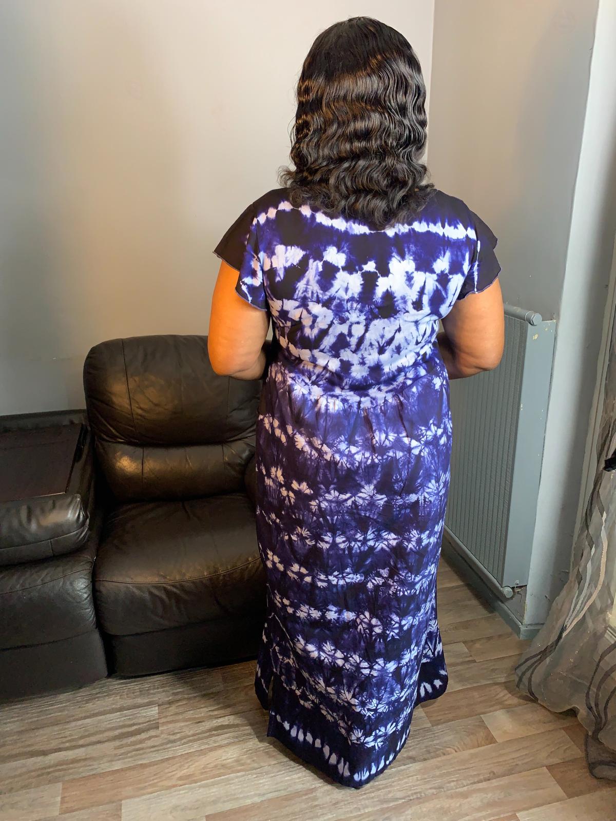 T-Shirt-Kleid im Indigo-Batik-Stil. Elastanmaterial für das T-Shirt und Baumwolle für den Rock. Handgefärbte T-Shirts mit einem sehr langen, sehr langen handgefärbten Rock. Wir stellen unsere T-Shirts nicht selbst her, wir kaufen sie: blank weiß und färben sie von Hand; Wir nähen unsere extralangen Röcke von Hand und stellen sie für Sie zusammen. V-Ausschnitt