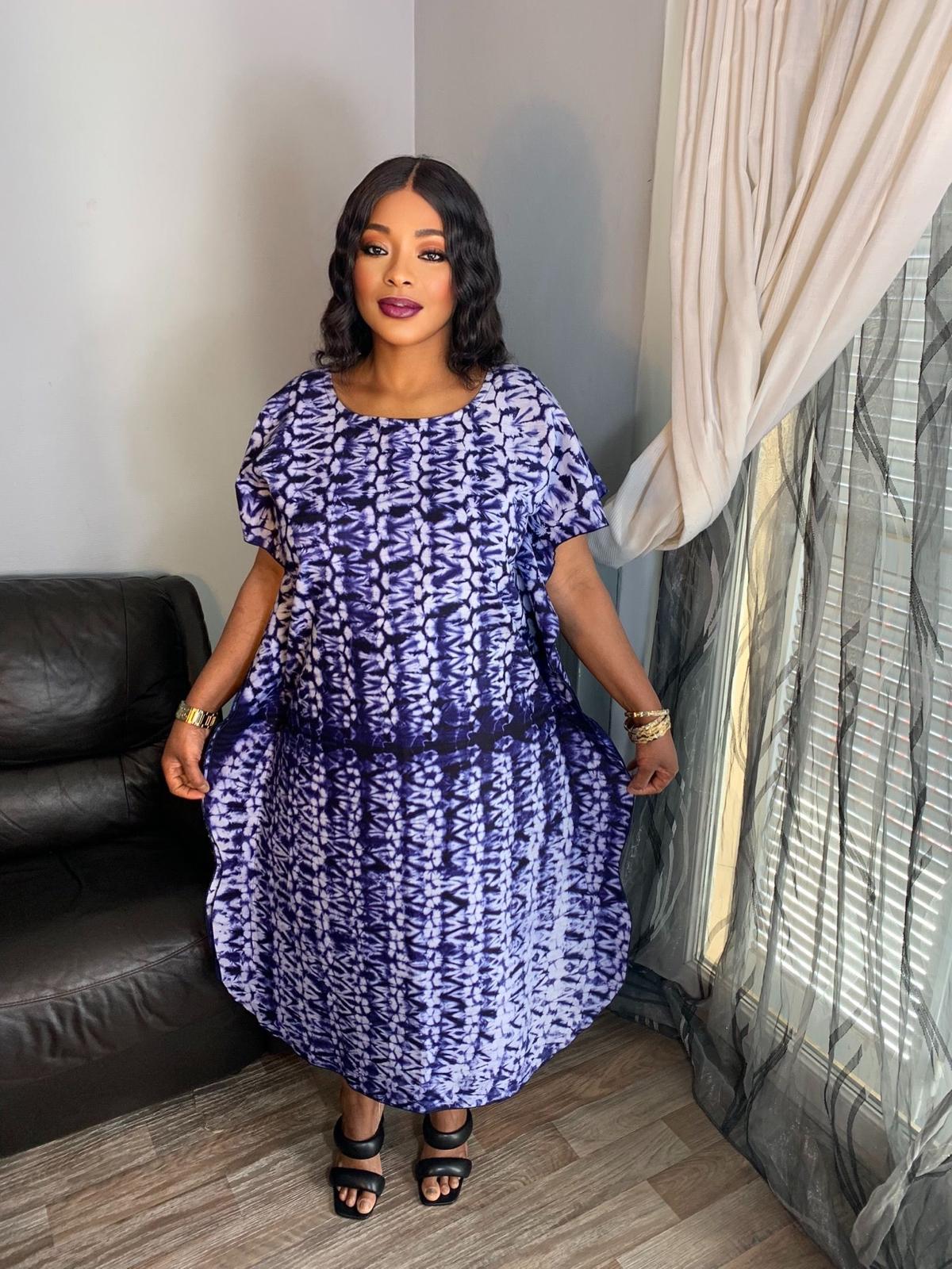 Add a personal touch to your wardrobe with our beautiful Bazin du Mali Kaftan Tie and Dye Cotton Dresses. Colors: Navy Blue and White.