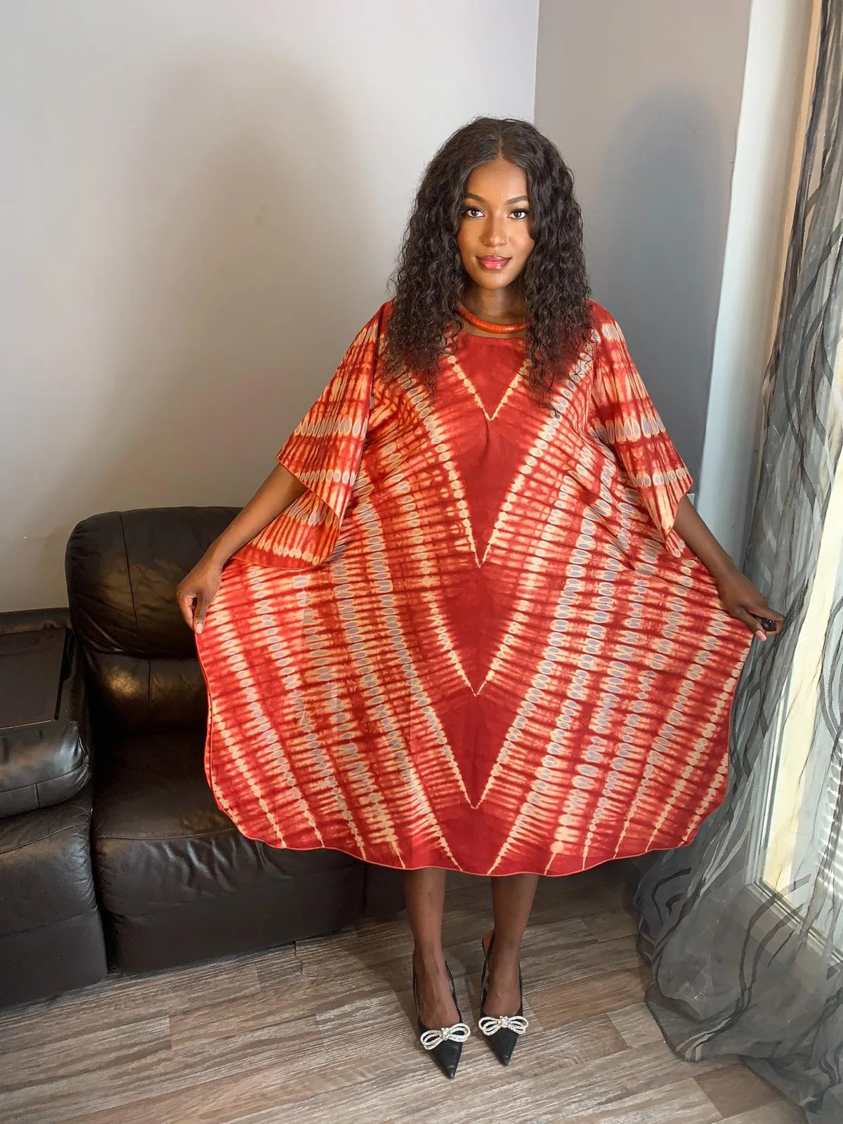 The Viollette Adire Kampala dress combines traditional elegance and modernity with its vibrant colors and tye and dye pattern, while the inserts on the sides add a sophisticated touch to this unique piece.
